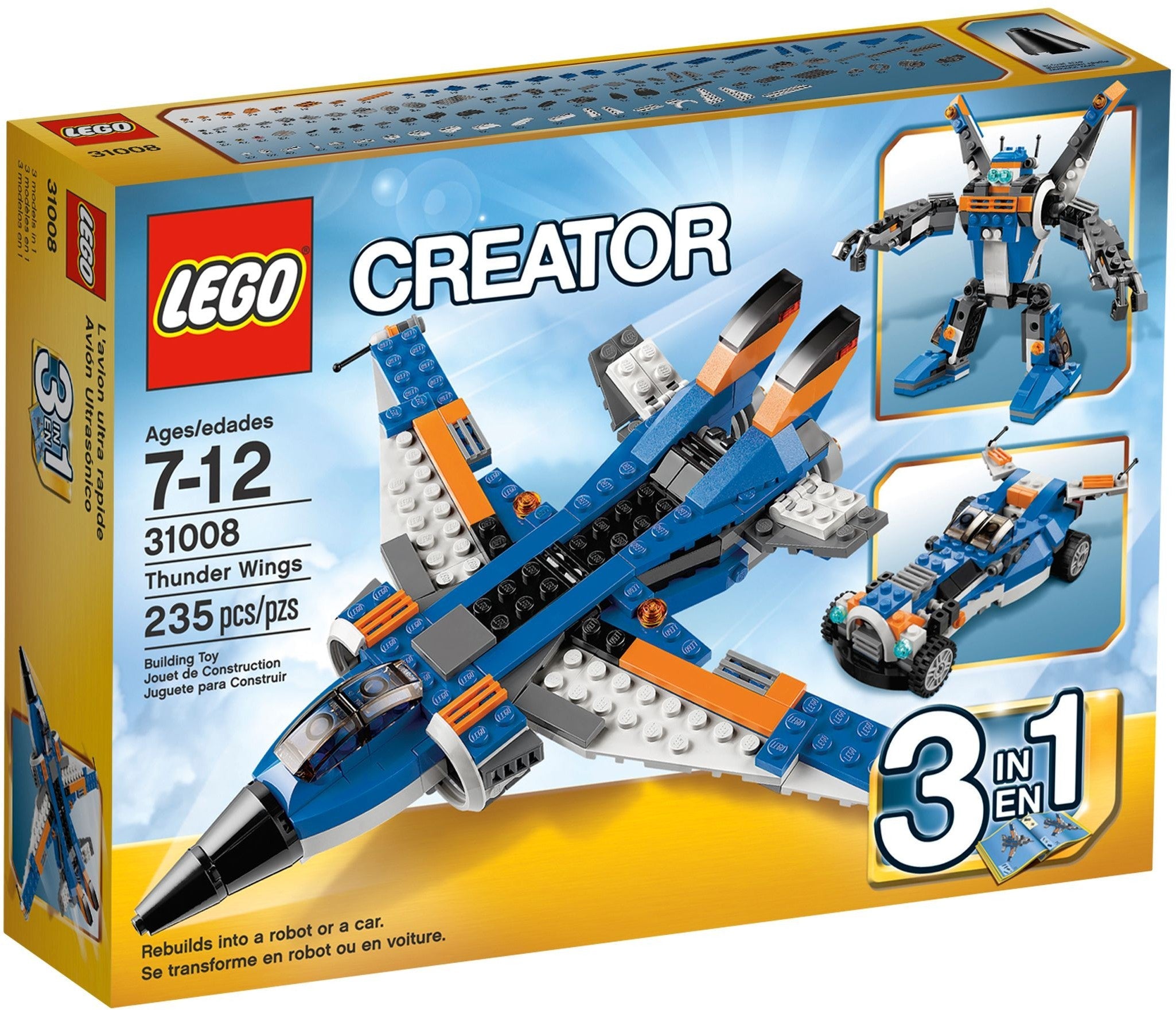 Scream through the skies with the Thunder Wings jet! Fire up the powerful afterburners as the swept-back wings and large air intakes send this super jet soaring into the clouds! Then rebuild it into a robust robot with poseable limbs or a futuristic concept car with an angled rear spoiler and real rubber tyres.