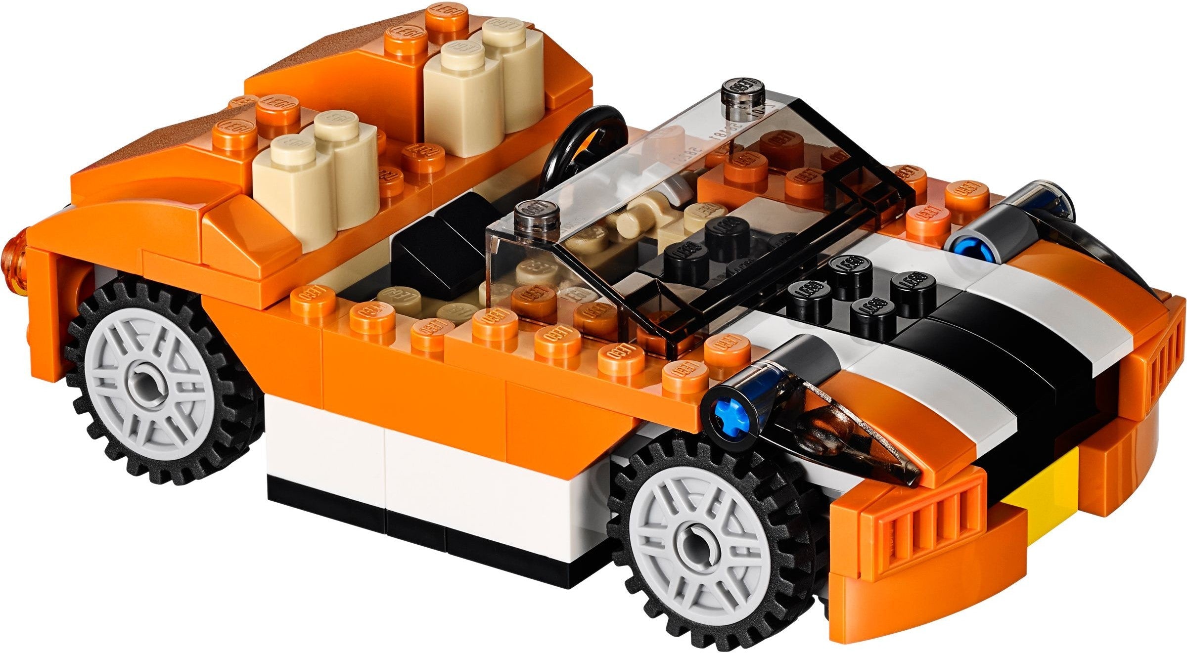 The sleek Sunset Speeder sports car is perfect for cruising the streets. Featuring an orange body with super-distinctive black and white stripes, racing wheels, and cool headlights, this is one car that you’ll want in your LEGO® collection. For added variety, rebuild it into a truck cab or an even faster racing car.