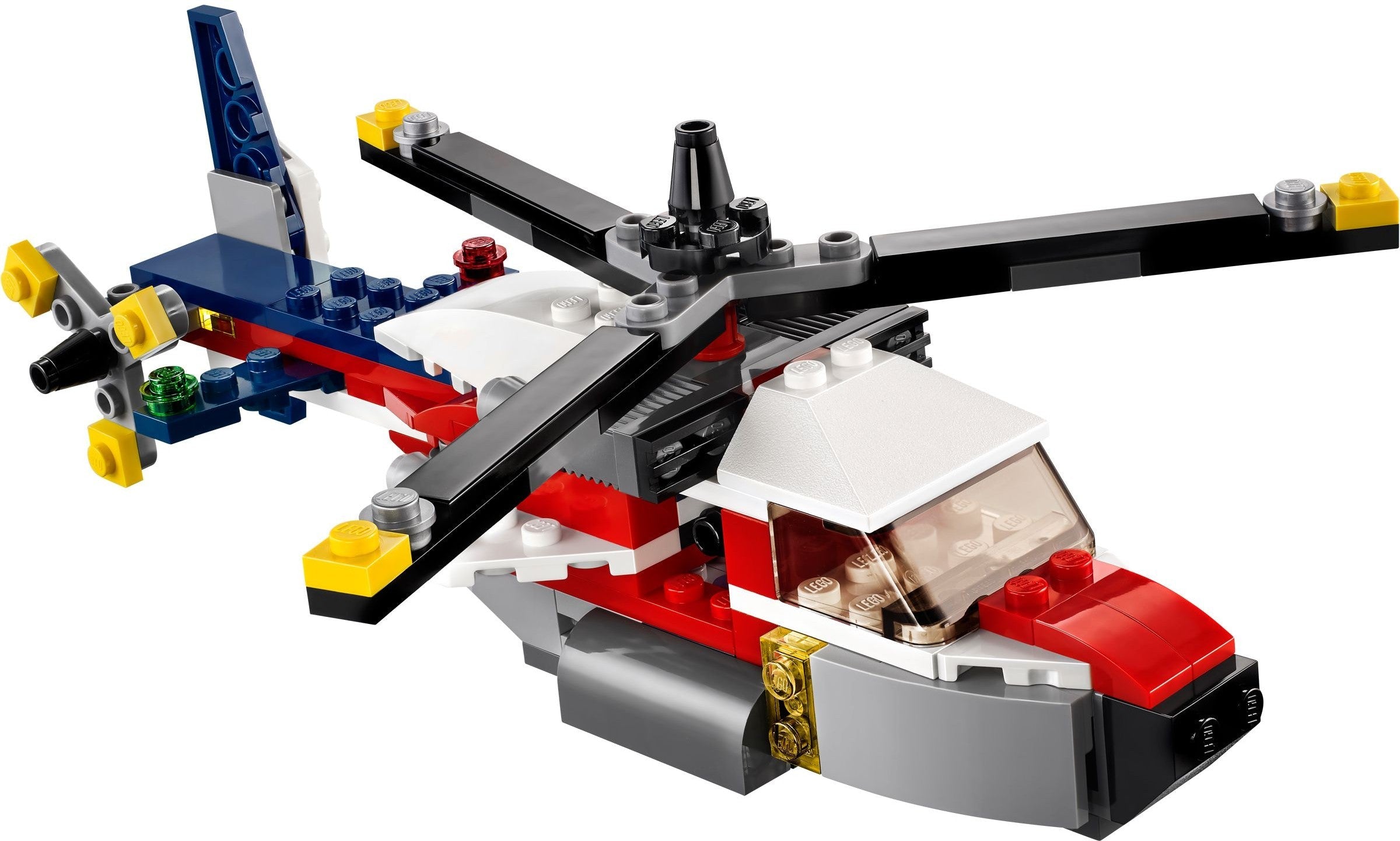 This Twinblade aircraft is literally revolutionary! Spin the rotor blades and lift off like a helicopter. Then rotate the engines 90 degrees and power forward like an aeroplane, while the dual tail fin ensures steady flight. With its red and white colouring and engine exhaust details, the Twinblade is easy to spot high in the sky. Back on the ground, use the ramp to access the cargo hold, and when you want a new challenge, rebuild it into an old-fashioned aeroplane or a speedy helicopter.