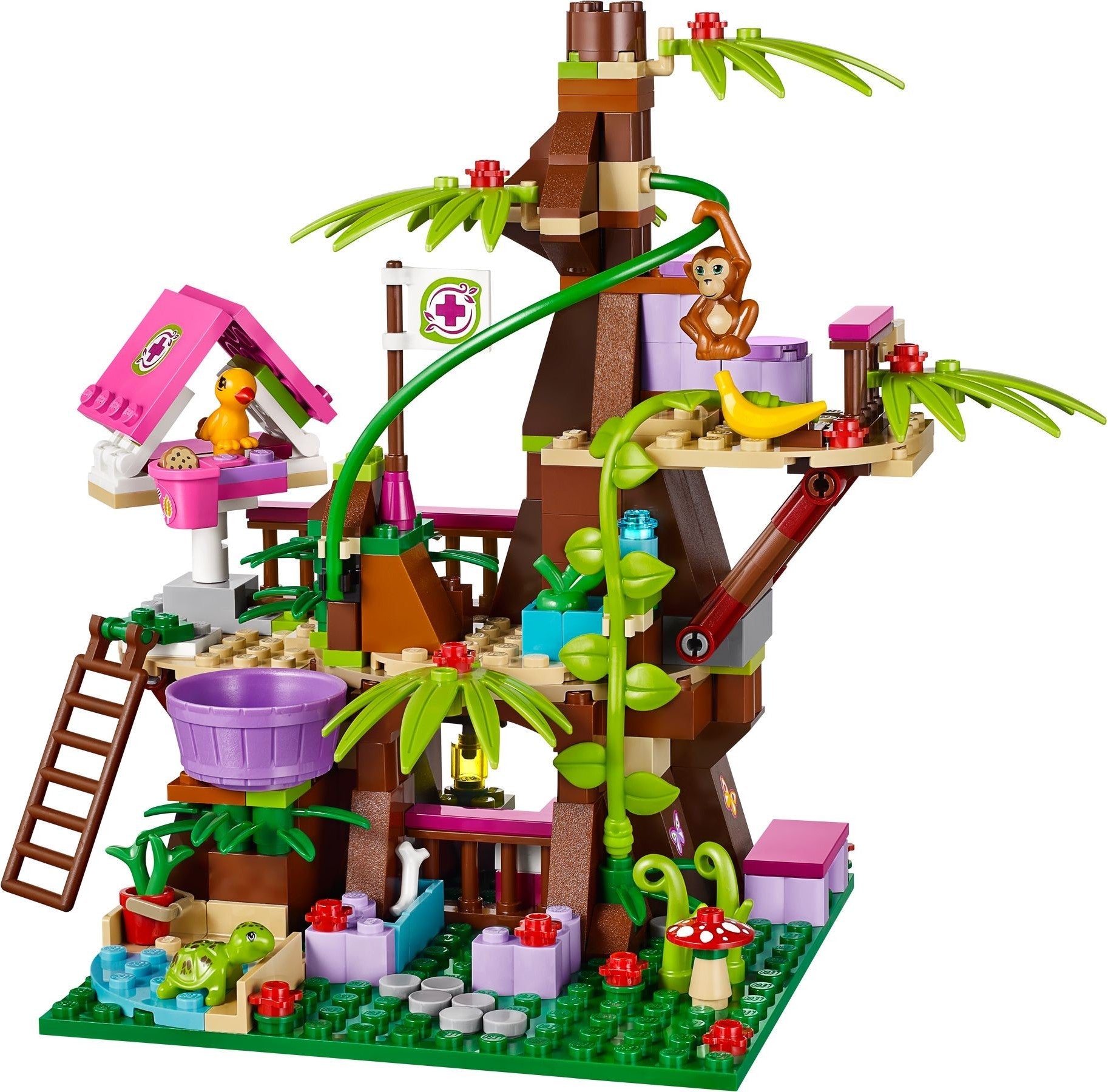 Look after the creatures rescued by the LEGO® Friends at the Jungle Tree Sanctuary. Help Mia feed the lion cub in his paddock before she goes to top up the parrot’s biscuits in the birdhouse. Now it’s time to give the monkey a bath—watch him slide down the vine right into the bucket of water! Then head to the laboratory to examine some jungle samples and note your observations on the computer. Watch the playful animals from the platform before settling down for the night in the cosy bedroom.