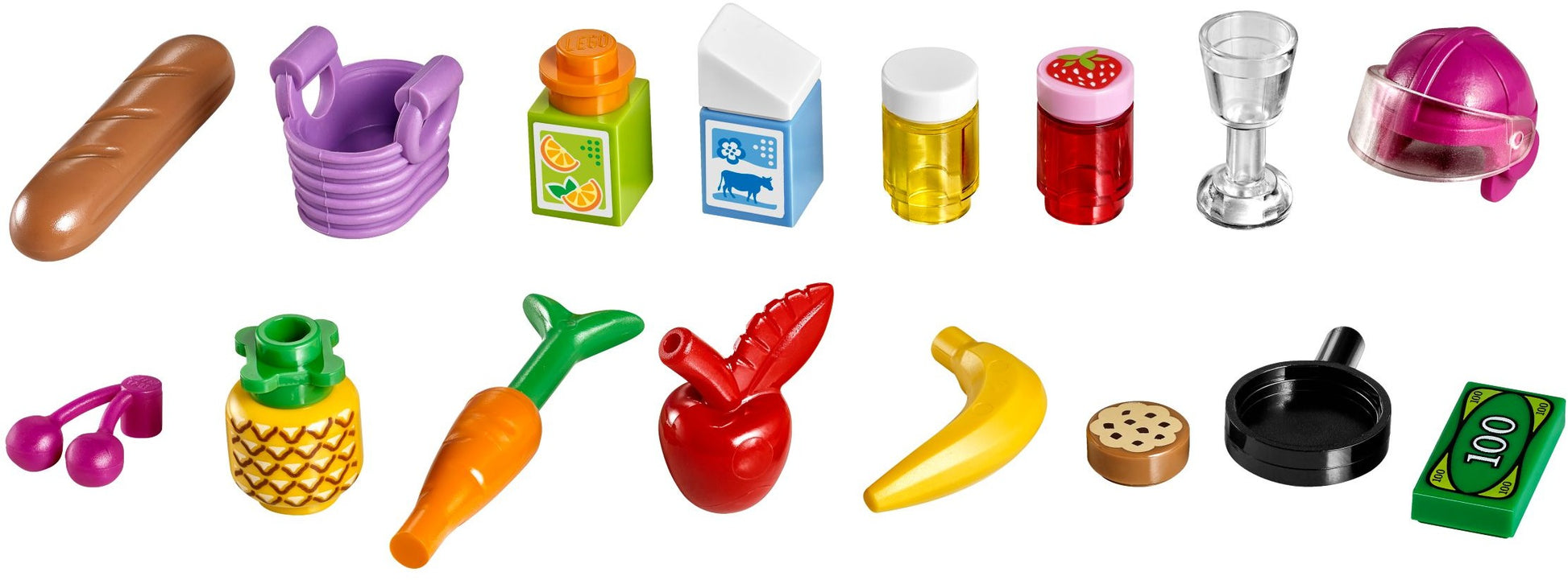 Pick your fresh produce at the Heartlake Food Market! Help Maya run the store and bake fresh cookies every morning to sell to her customers. Check the orders you receive on the computer and deliver them with the scooter all over Heartlake City. Today Mia has come to the store—help her find and weigh the best-looking vegetables and pick up fresh flowers, juice, milk, and homemade marmalade. Then sit down with Maya for a yummy cake and refreshing drink in her apartment just above the store. At the end of the day, close the cute window shutters and let Maya’s cat in before she settles down for the night in her attic bedroom. Includes Mia and Maya mini-doll figures, plus a cat.