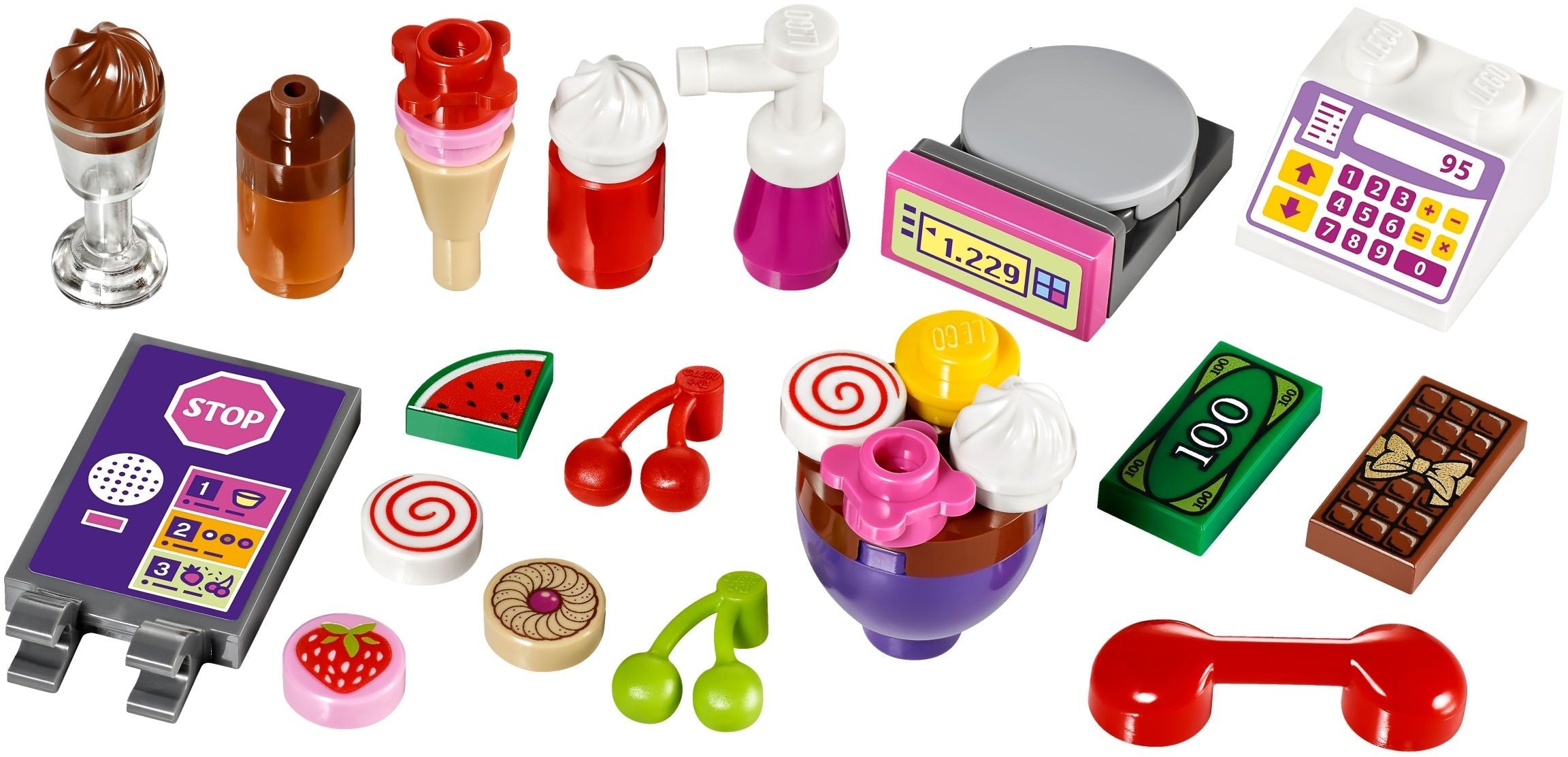The LEGO® Friends Heartlake Frozen Yoghurt Shop comes with a frozen yoghurt machine with self-serve function, a bar with a choice of toppings, weighing scales, a phone to take orders, an inside seating area, and an outside table with a parasol. There’s also a drive-through with an ordering station and a cool yellow car with room to carry your frozen yoghurt on the back. Includes 2 mini-doll figures.