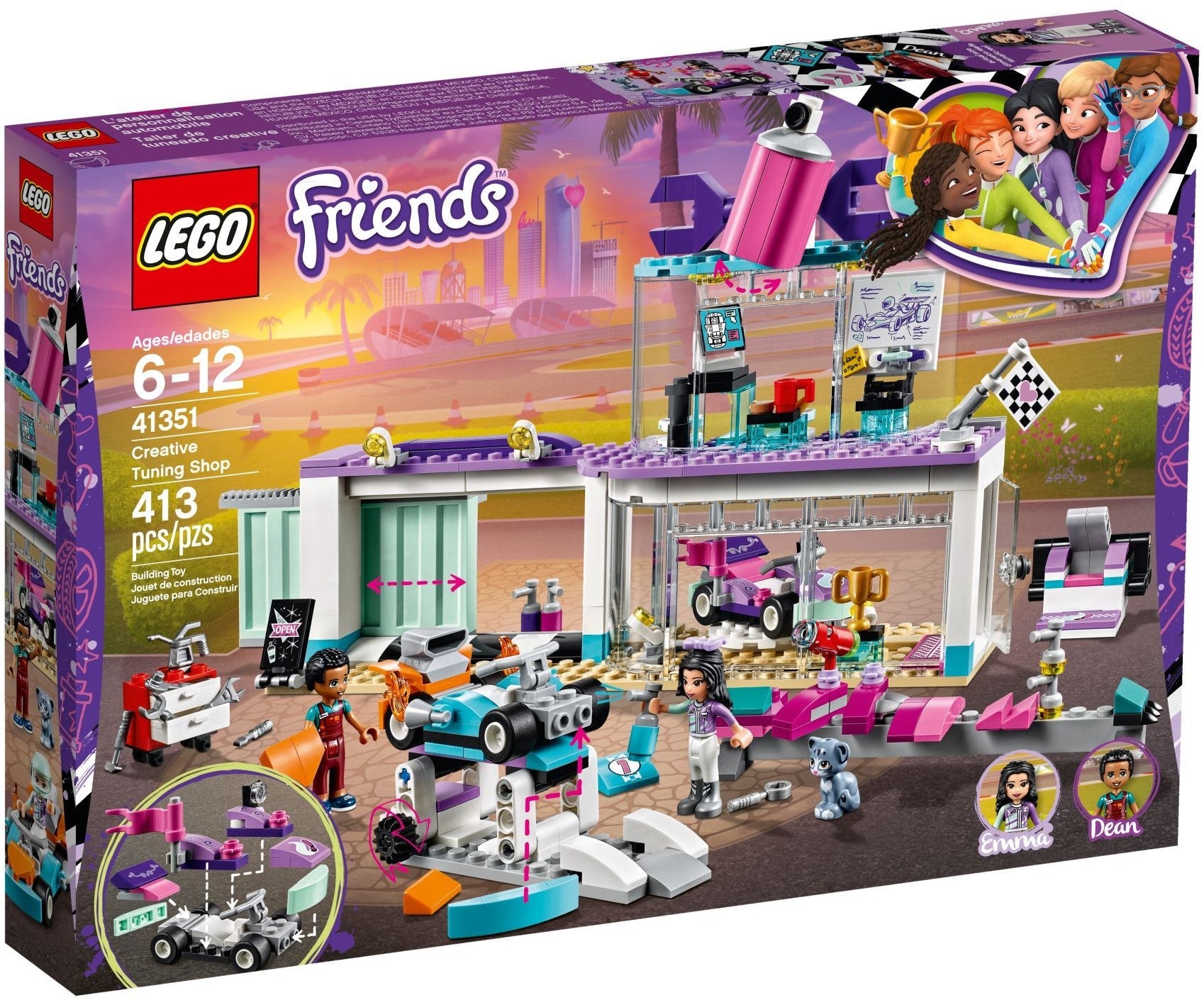 The LEGO® Friends 41351 Creative Tuning Shop features a showroom with sliding door function and revolving floor, a lifting workshop platform, opening tool drawers, and an upstairs office. This LEGO Friends set also comes with 2 go-karts plus lots of extra pieces to create and customise them in all sorts of ways. There's also a go-kart launcher to help the finished go-karts speed off to the big race, plus 2 mini-doll figures and a cat figure.