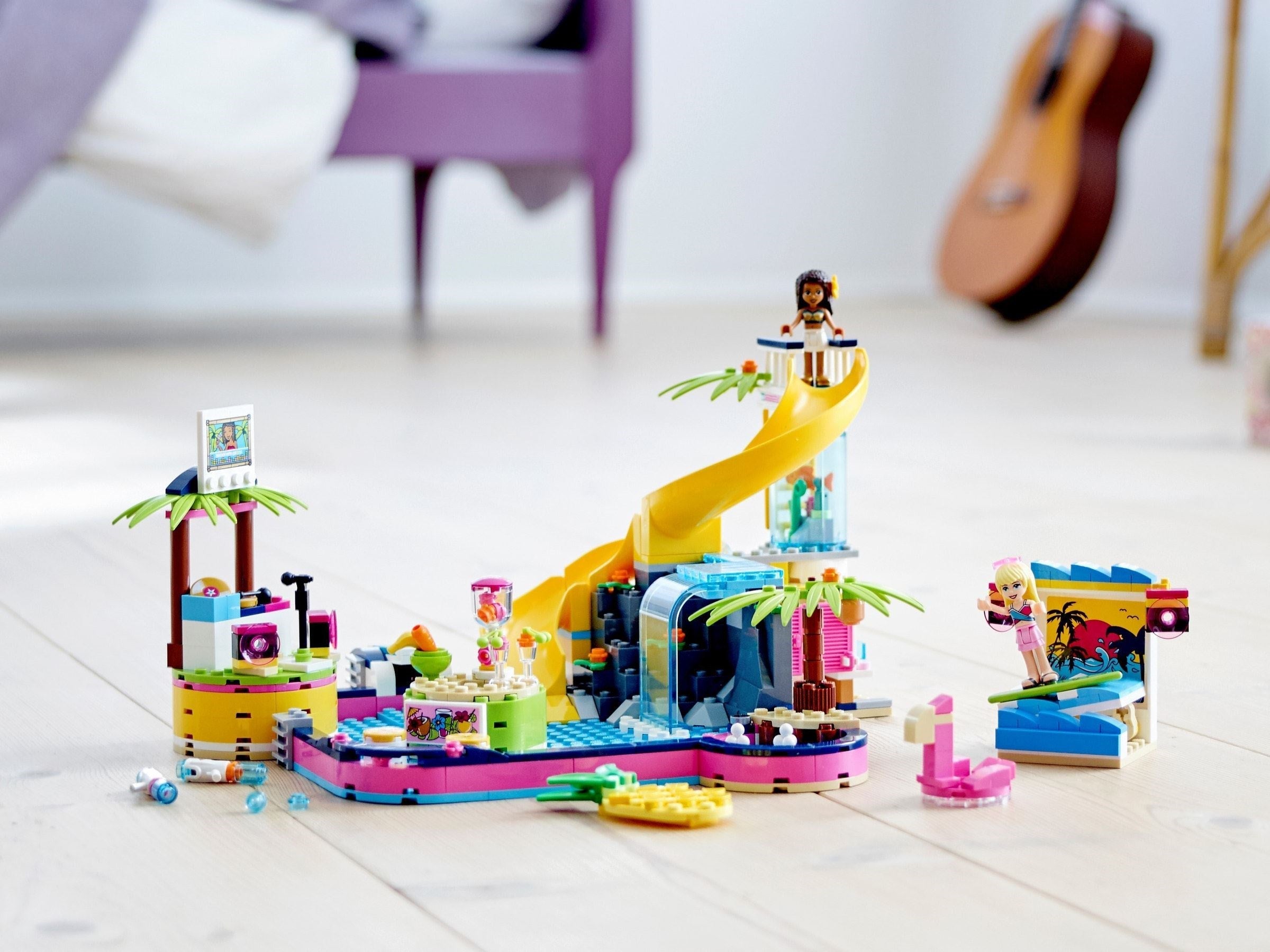 The LEGO 41374 Andrea's Pool Party is a 468-piece set from the LEGO Friends series, released in 2019. This vibrant playset features a swimming pool complex complete with a slide, waterfall, wave machine, juice bar, and DJ booth, offering a lively setting for imaginative play.