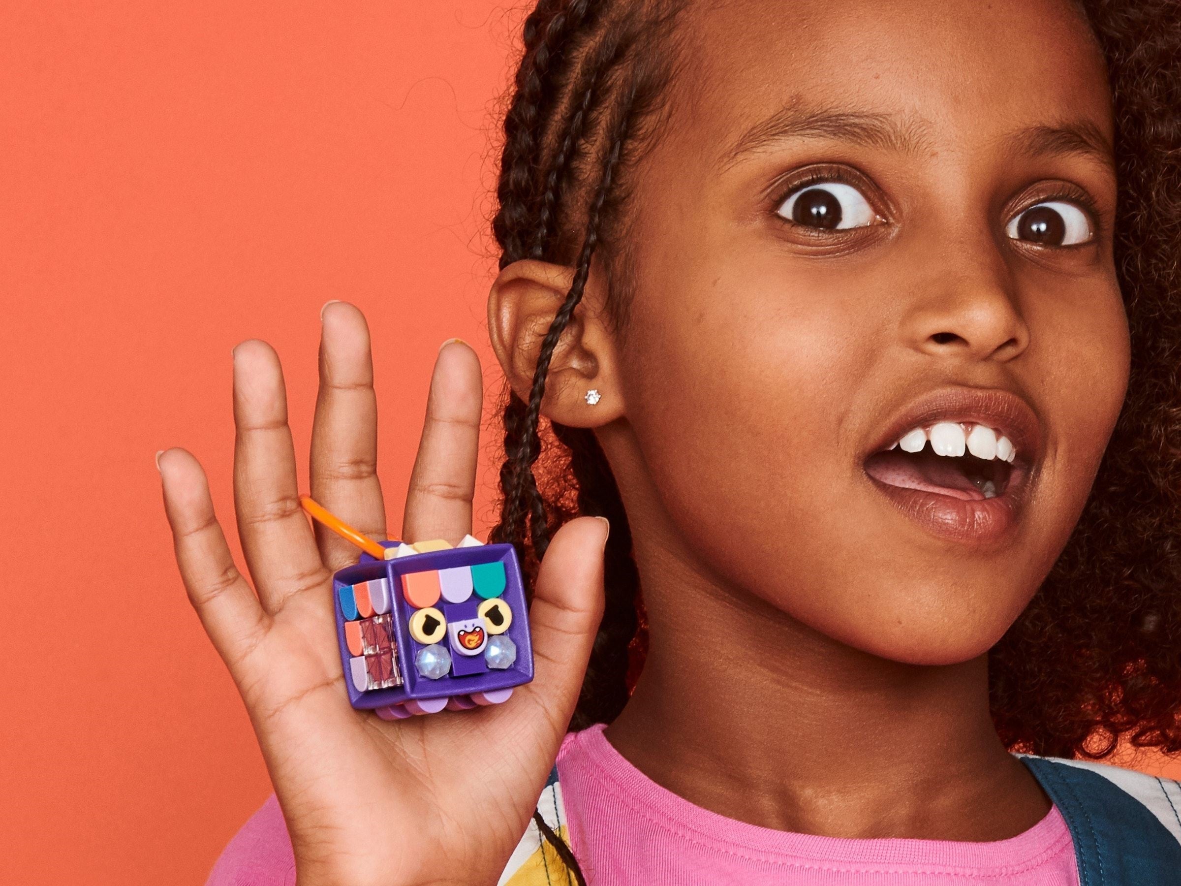 Customizable self-expressionThis hands-on craft treat features a cube with room for lots of fun designs, a ring to attach it with, and a tile remover. Kids can use the lavender, blue, teal, and pink tiles to design a unique dragon. To push their creativity, they can grab a Series 4 bag (41931—sold separately) of Extra DOTS tiles and create all sorts of new faces and designs.