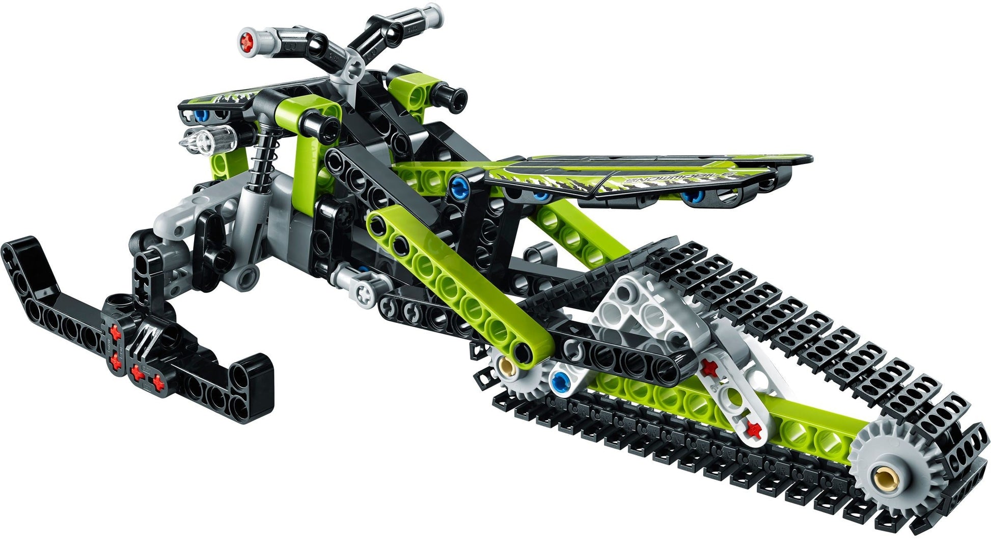 A super-cool Snowmobile for off-piste winter fun, this great model has suspension for each of the two front skis as well as a rear track to help it over any obstacle. There are also new elements, like a steering arm, steering bearings, and a steering lock, and with aggressive, ripped-effect decals, this realistic 2-in-1 model would be right at home with the coolest off-road bikes and other extreme sports equipment! Rebuilds into a Snow Motorcycle.