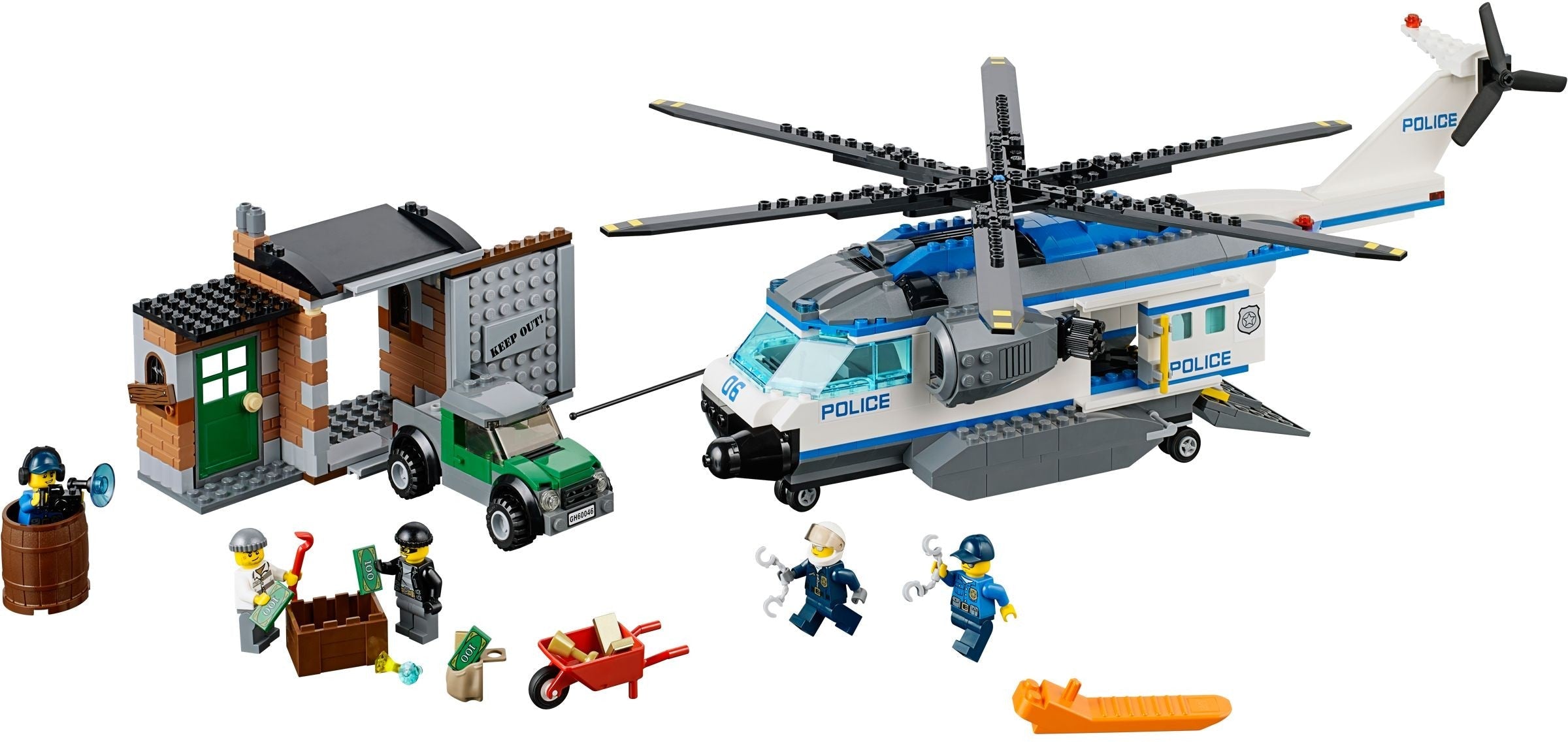 The crooks have arrived at their hideout and are offloading their stash of stolen goods. Help the policeman on a stakeout monitor their every move from the barrel using his camera and special radar. Then use the walkie-talkie to call in the police helicopter with its detailed engine, cockpit, and rear crew compartment. When it arrives, hover overhead, slide the side door open, attach the policeman to the rope, and launch a surprise abseil ambush! And if the crooks try to get away, slap the handcuffs on them, load them into the helicopter, and fly them back to prison! Includes 5 minifigures with assorted accessories: 3 policemen and 2 crooks.