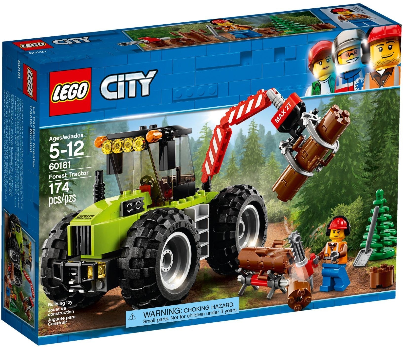 Work in nature with the LEGO® City Forest Tractor, featuring a moving arm with opening claw and massive wheels, plus a small log stand, 2 chains, 2 buildable logs, a small pine tree, a chainsaw, and a shovel. This cool toy for kids includes a minifigure.