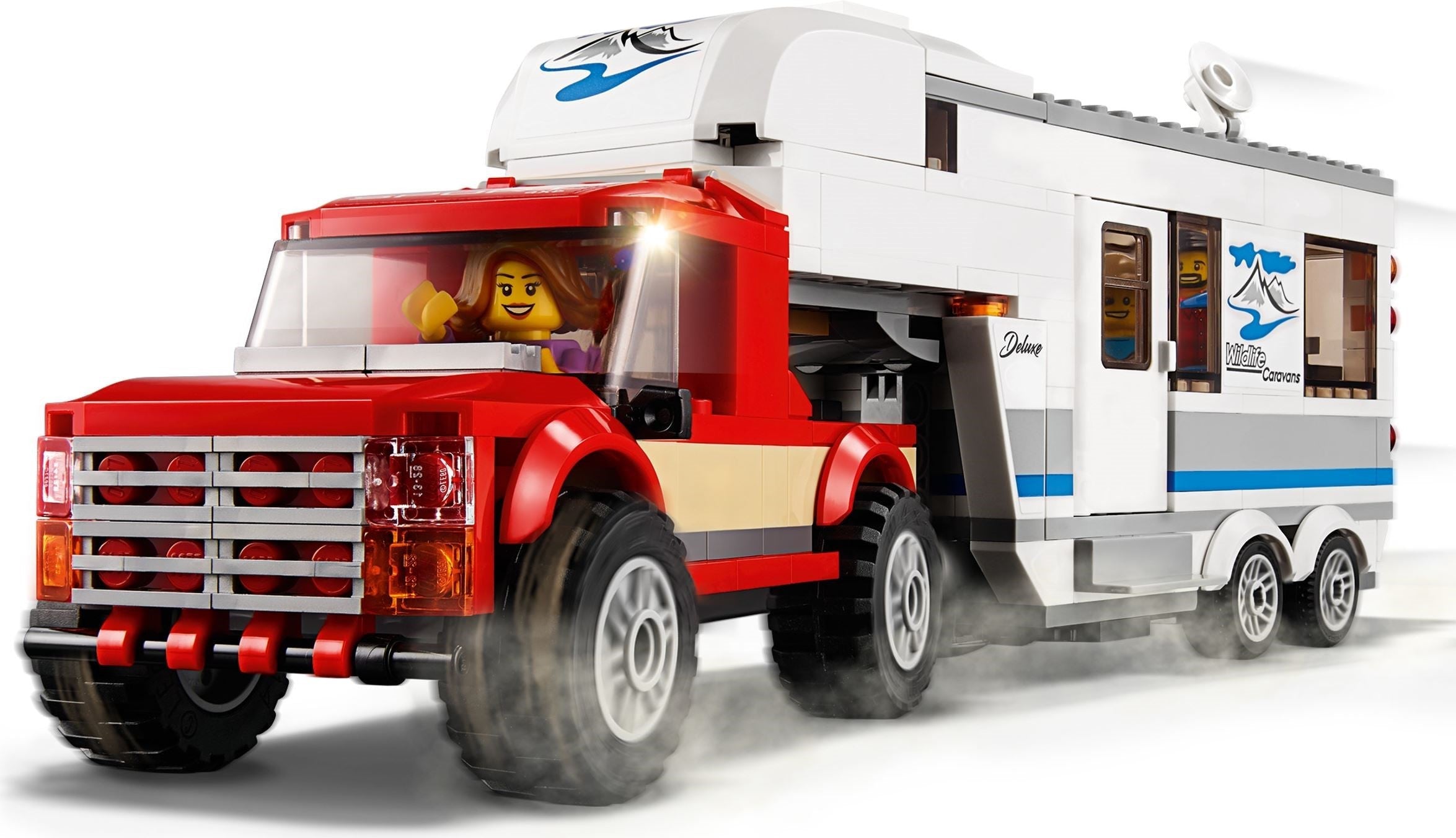 Head out into nature with the family in the LEGO® City Pickup & Caravan, featuring a big caravan with an opening side, door, a removable front roof to access the bedroom, removable furniture, and a separate support leg to stand alone, plus a pickup truck with a removable cab roof and bed with a caravan hitch. This fun toy for boys and girls includes 3 minifigures and a crab figure.