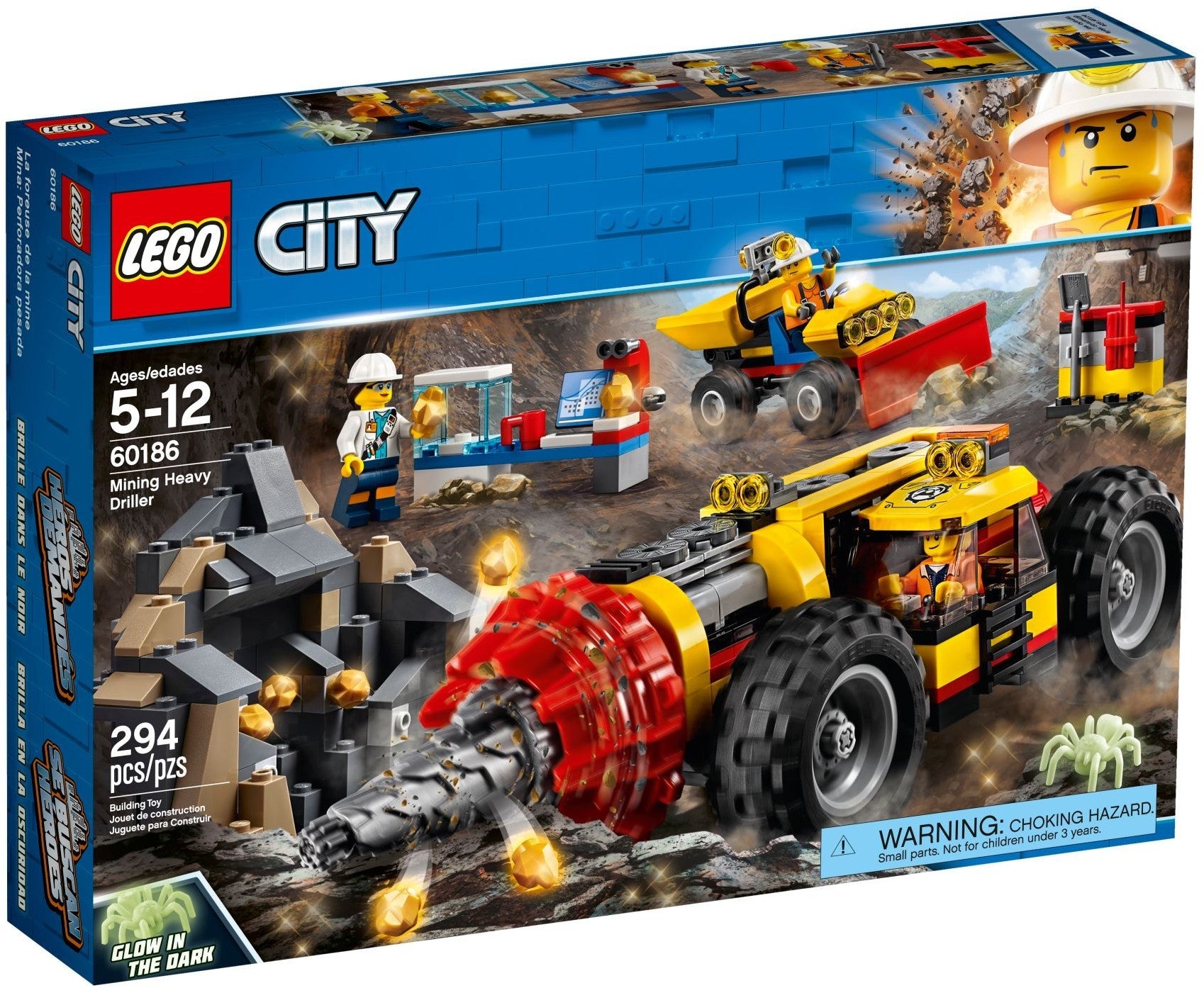 Grab your hard hat and head out with the LEGO® City Mining Heavy Driller to make new discoveries! This fun toy features a functioning heavy driller with minifigure cab, a shovel loader with tipping bed, plus a mine cave with breakaway golden nugget elements and a mobile lab. Includes 3 minifigures and a glow-in-the-dark spider figure.