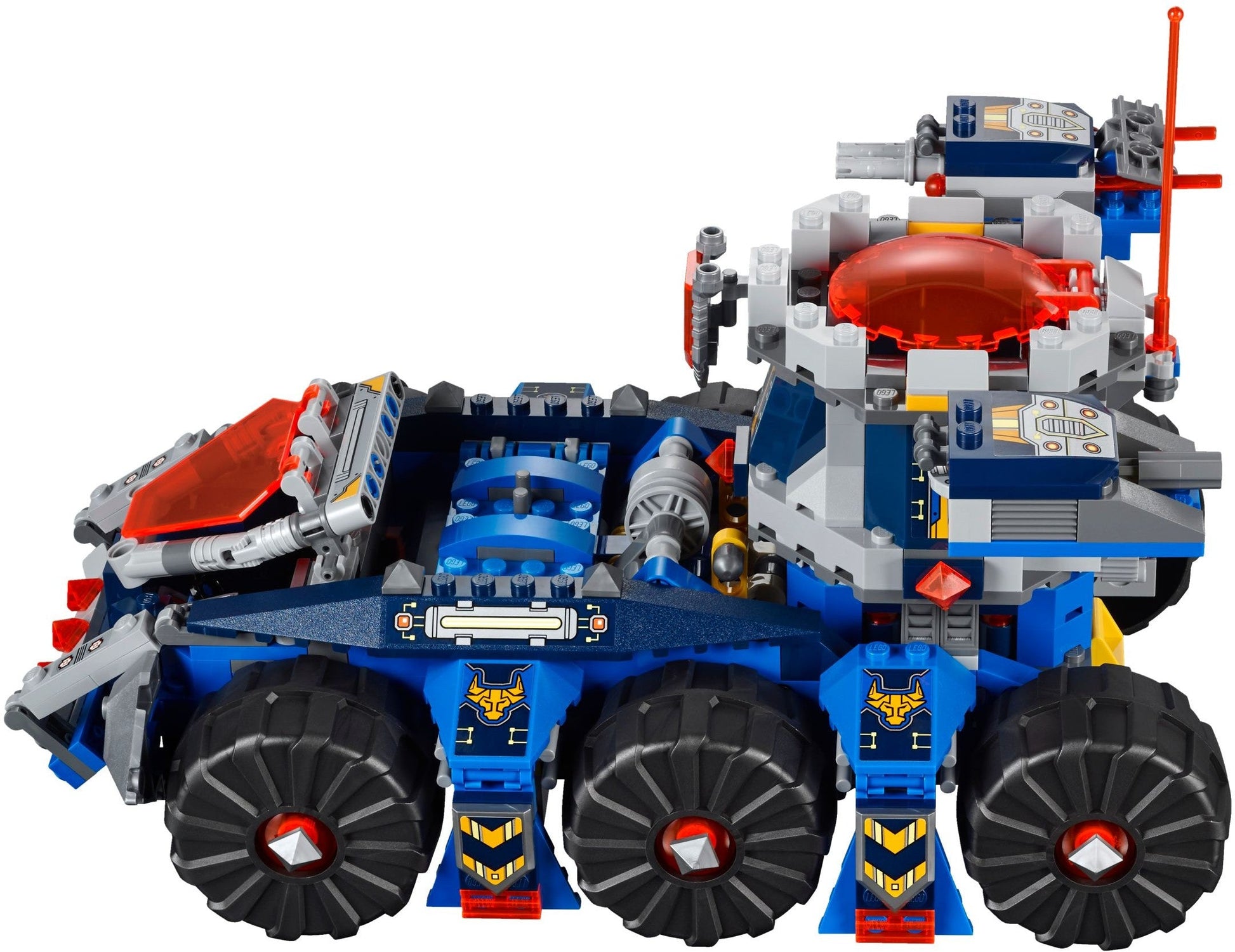 • Axl's Tower Carrier features a rotating, detachable gun turret with wheels plus dual spring-loaded shooters and a disc shooter, a storage vault for the Book of Fear, a hidden catapult, a control room, plus 2 cockpits for Axl and an Axl Bot, and 4 concealed side storage areas for the Axl Bot weapons and tools.