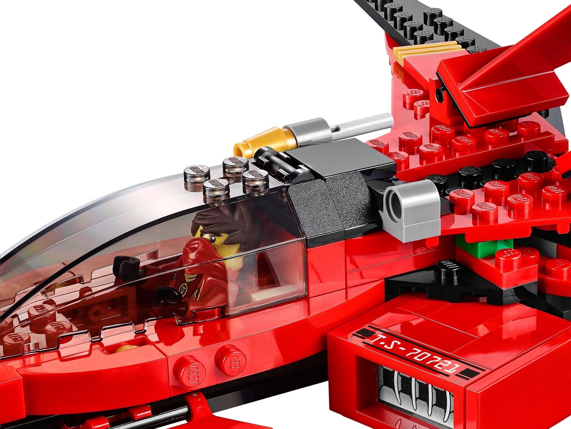 Kai has taken over a civilian vehicle and used his Techno-Blade to turn it into an awesome red and gold Ninja Fighter! Take off and weave between the skyscrapers of New Ninjago City with Kai in the cockpit. Shoot the gold-tipped flick missiles into the path of the evil General Cryptor and evade blasts from his ground-to-air laser rocket launcher. Defeat General Cryptor, then flip the wings back to engage speed mode and zoom away. Includes 2 minifigures with weapons and an accessory: Kai and General Cryptor.