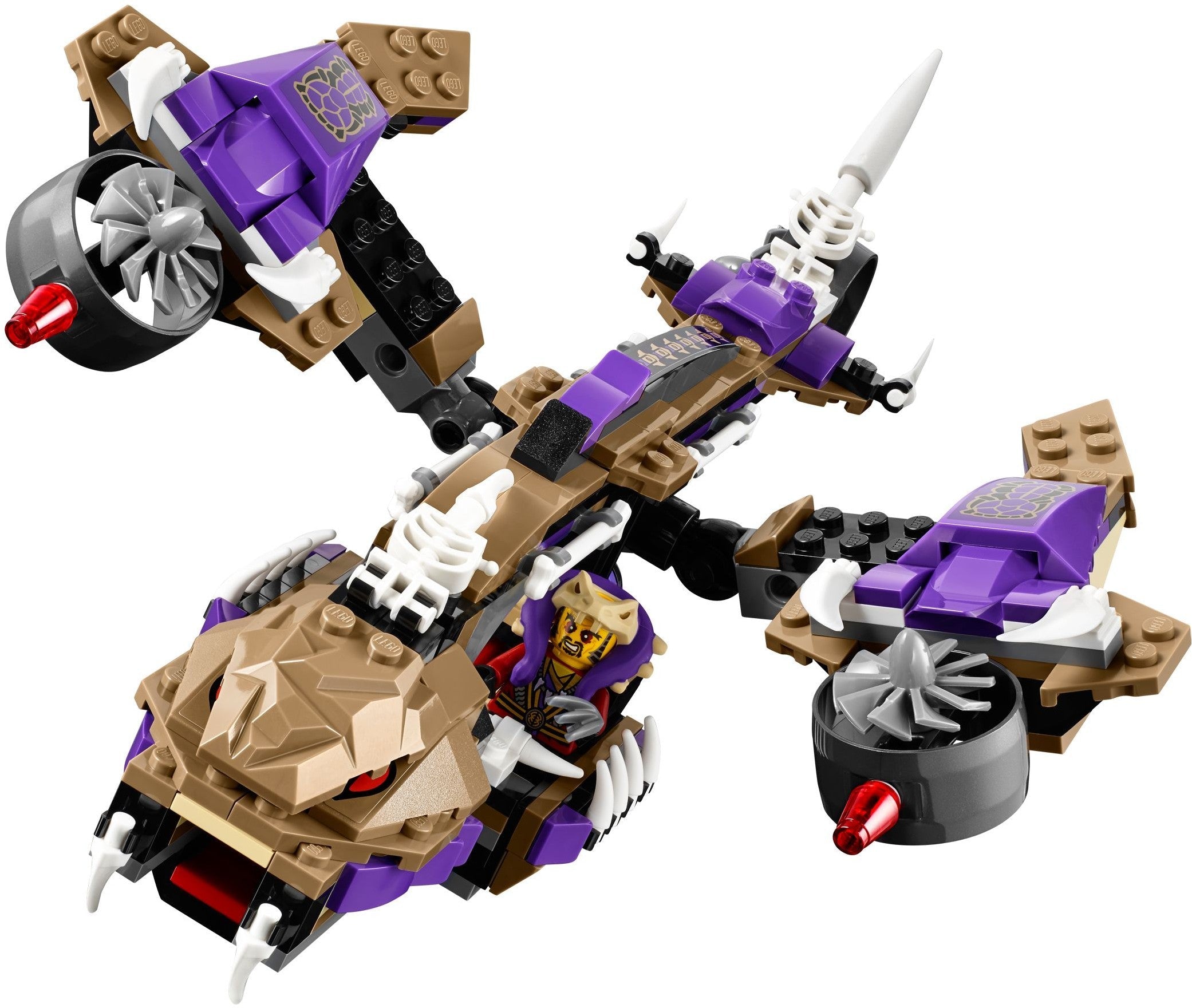 Evil Chen and Eyezor are pursuing Skylor through the island’s jungle in the Condrai Copter. Help Skylor to escape on her flying rocket board, swerving away from the Condrai Copter’s flick missiles and evading the huge net shot from the snake’s mouth. Dial up the high-octane thrills as the bad guys flip the wings into attack mode, leap out of the double cockpit, and hang off the side handlebars. Speed out of there before they can swoop down and capture Skylor! Includes 3 minifigures with assorted weapons: Skylor, Chen, and Eyezor.