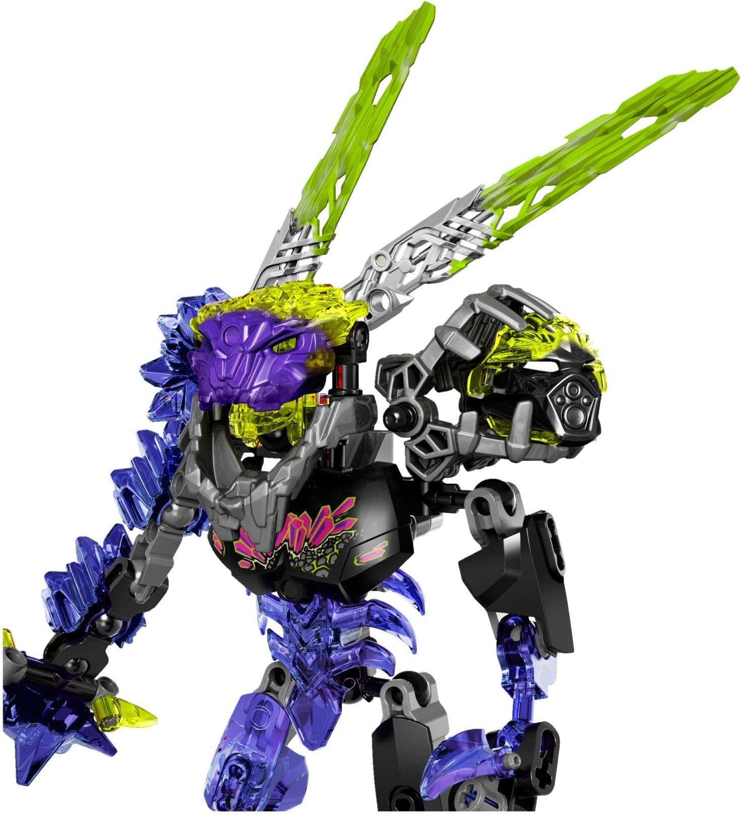 Umarak the Destroyer has called on the Quake Beast to help him defeat the Toa. Turn the wheel to activate the punching battle arm, and use the crystal fists to hammer the ground to start an earthquake! Dig into the ground with the powerful claws to set an ambush! Spread fear across the villages of Okoto, but watch for the LEGO® BIONICLE® heroes and their swinging punches that will pop off the Quake Beast's mask!