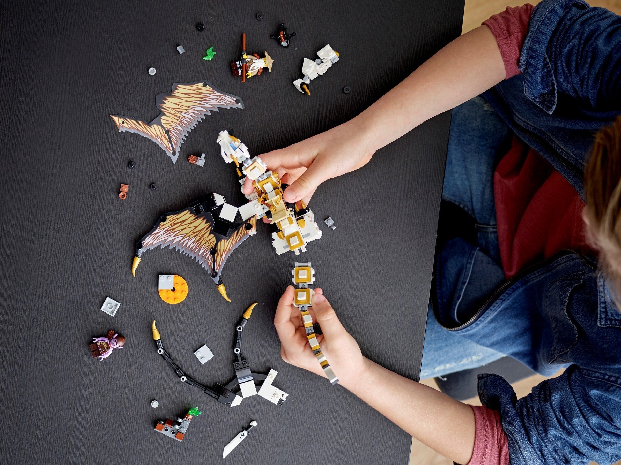 This LEGO® NINJAGO® Wu’s Battle Dragon (71718) building set for kids with 2 minifigures will be adored by fans of ninja toys, who can use it to stage their own fantasy stories from the NINJAGO TV series. The awesome posable dragon can move its wings, tail, feet, and head.