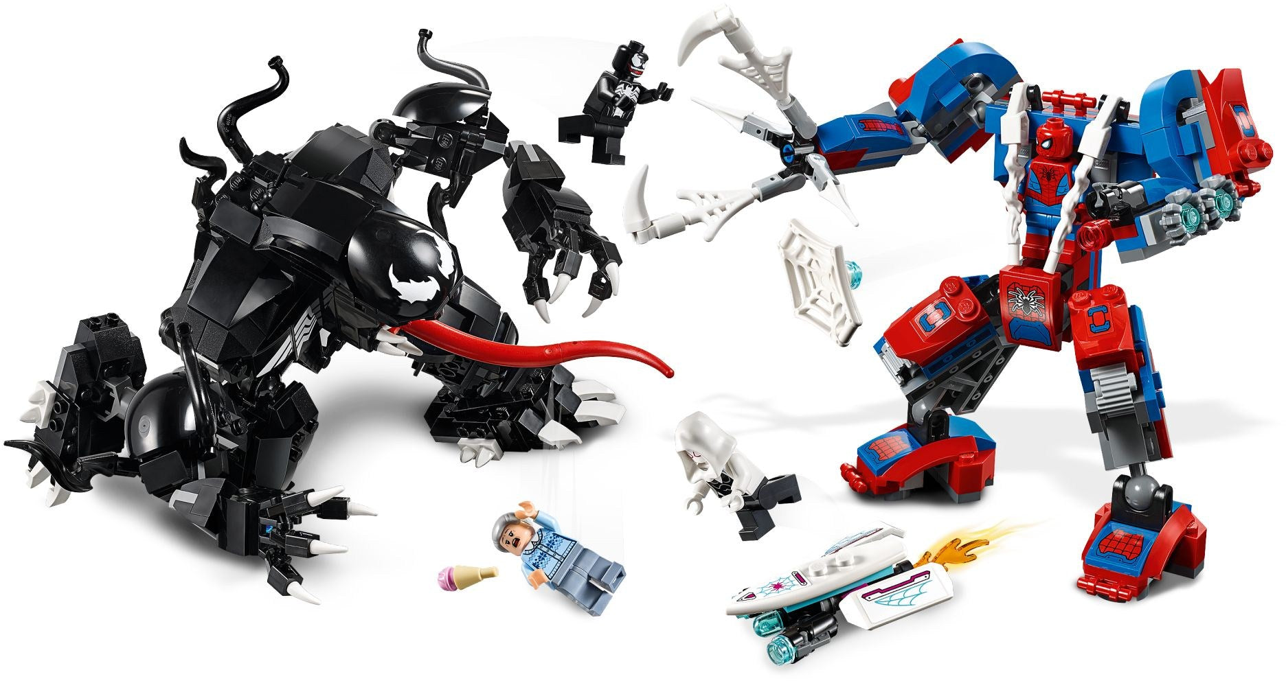 Join Spider-Man and Ghost Spider on a mission to release Aunt May from Venom’s clutches in a thrilling LEGO® Marvel Spider-Man 76115 Spider Mech vs. Venom battle. Match the posable Spider Mech, featuring an opening minifigure cockpit, tech spider/web shooter, and gripping claw, against the huge posable Venom Mech, with minifigure-grabbing claws. This superhero toy building kit includes 4 LEGO minifigures, Ghost Spider's hover board with 2 stud shooters, plus 9 assorted web elements to customise your builds, minifigures, and weapons.