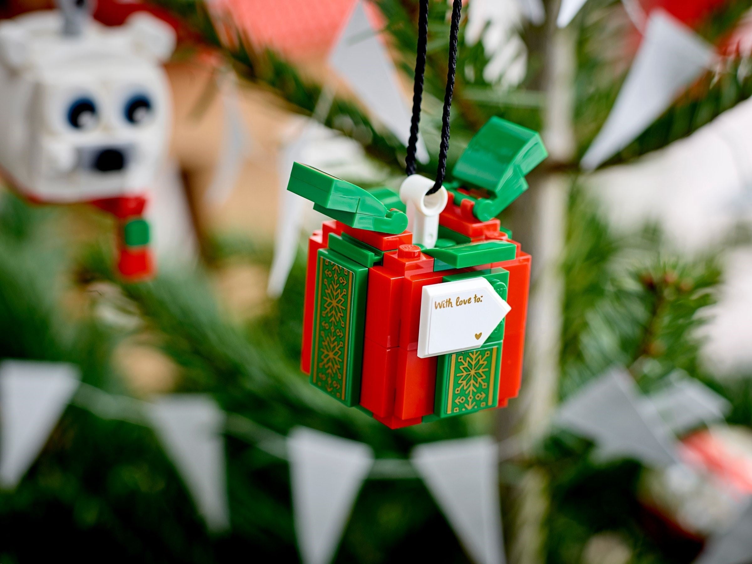 Add a little LEGO® magic to the holidays with the LEGO Polar Bear & Gift Pack (40494). This seasonal building set features a cute polar bear with a red and green scarf, plus a buildable wrapped gift with movable ribbons, golden stickers, and a “With love to” gift tag. Attach the included string and hang these colorful builds from your tree or wherever you wish to add a seasonal LEGO touch. Makes a perfect stocking filler for kids and LEGO fans of all ages.