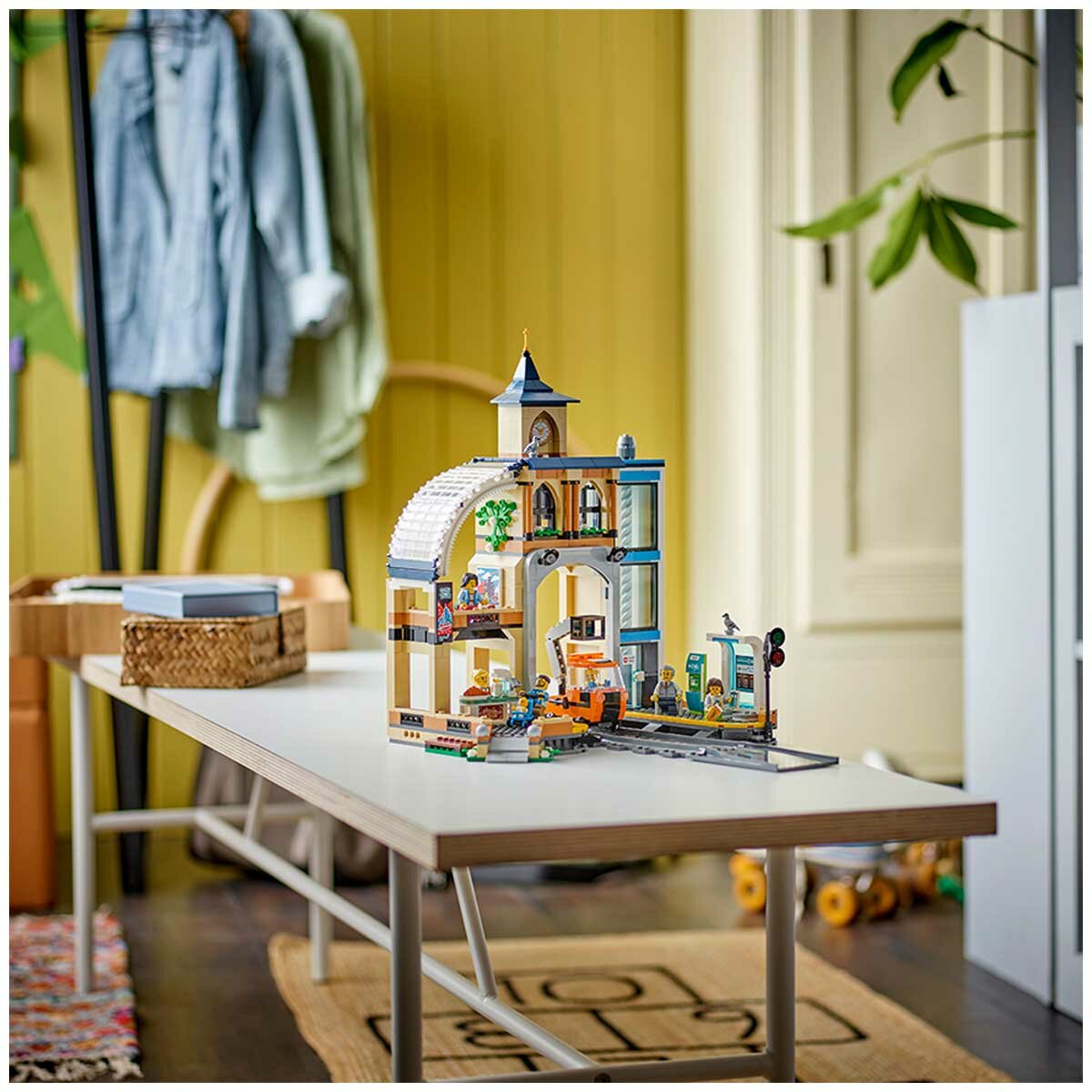 Featuring a charming clock tower, the station boasts a cozy coffee bar, a functional lift, a control room, a bus stop, two passenger platforms, a timetable display, and a ticket machine. The set also includes a railway maintenance vehicle with a cherry picker, six minifigures, a baby figure, and two pigeon figures for immersive role-playing adventures.