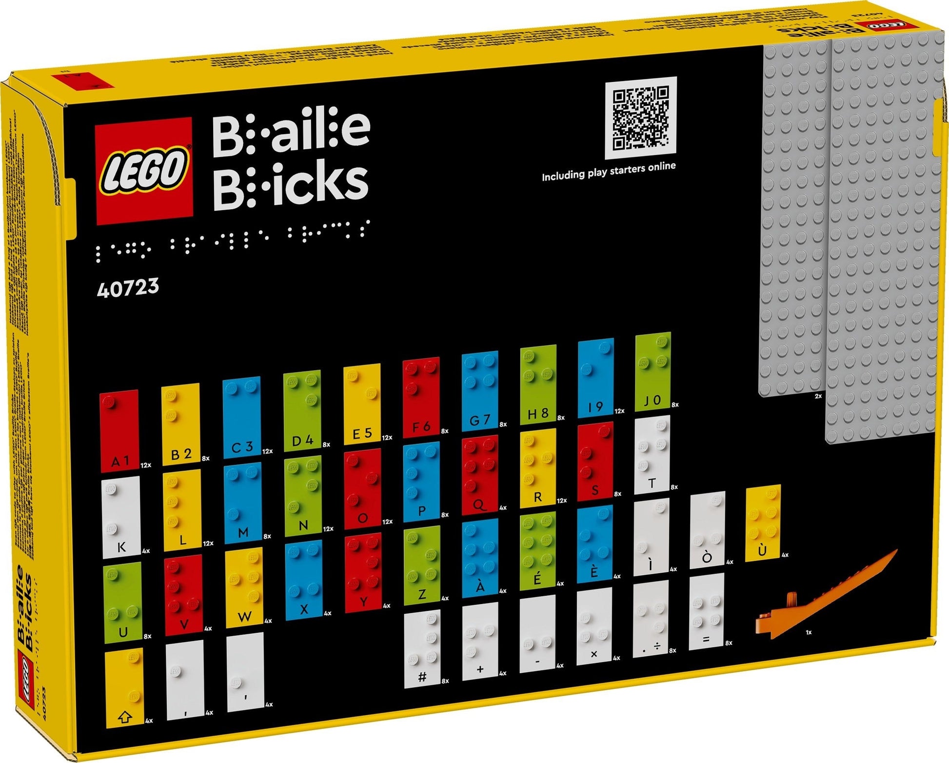 The LEGO Play with Braille—Italian Alphabet (40723) set contains 287 LEGO braille bricks, including letters from the Italian alphabet, numbers, special signs, and base plates. A complementary educational tool for visually impaired kids aged 6+ and their loved ones, it aids learning through play. For an introduction to the Play with Braille experience, play starters are available on LEGO.com to help learners understand the brick system and how the bricks link to the braille code characters.