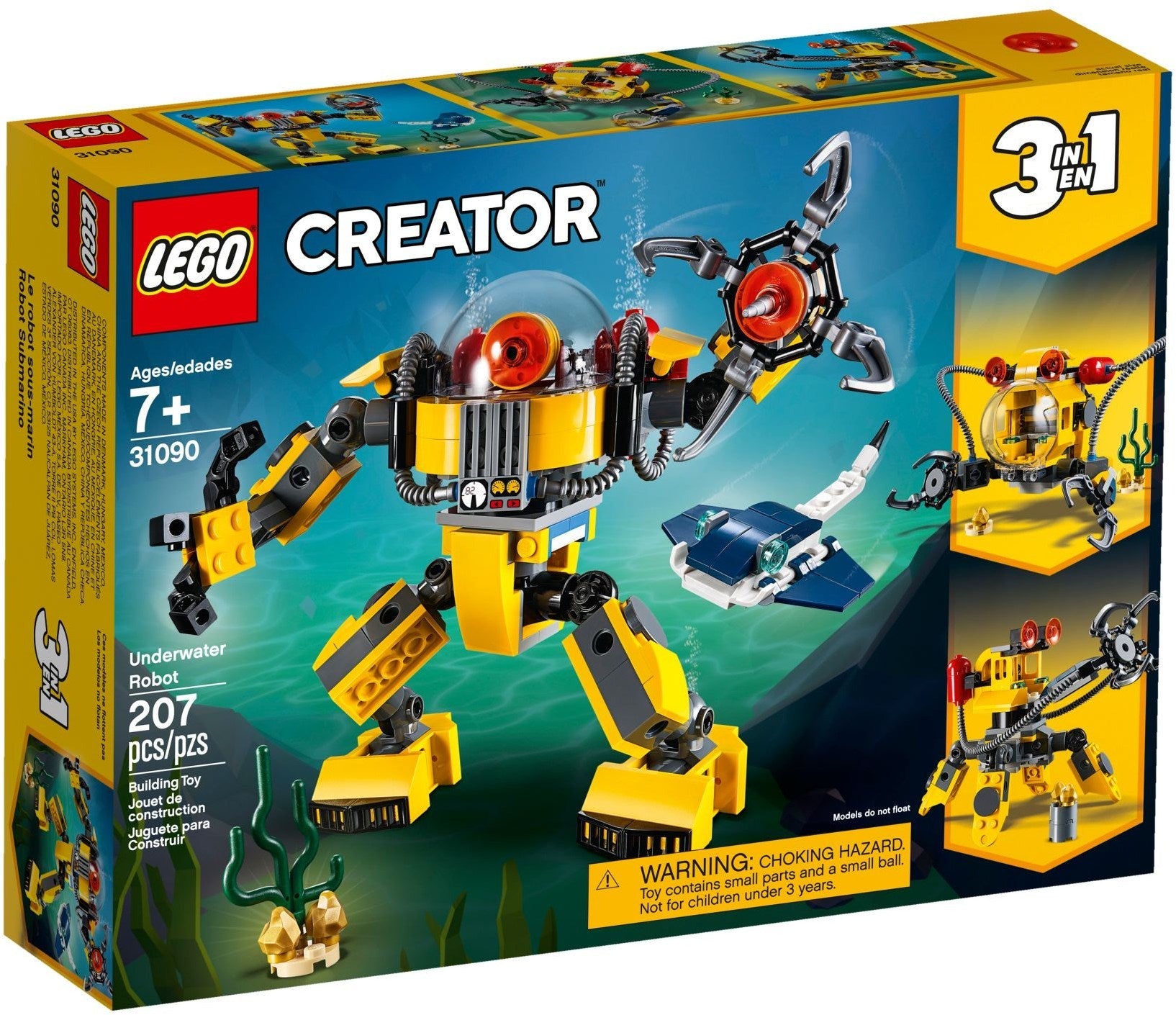 Build and rebuild an Underwater Robot, Submarine or Underwater Crane with this LEGO® Creator 3in1 set! Explore the depths of the ocean for sea treasures with the LEGO® Creator 3in1 31090 Underwater Robot, featuring highly posable joints, large transparent domed helmet, red robot eye, ballast tanks and huge feet for walking on the seabed. Remove the robot eye to transform the dome into a cockpit control center. The Underwater Robot toy also has a claw and drill at the end of its left arm and a grabber on its right. This set also includes a buildable manta ray and a small seabed build with a sea plant and golden nugget elements. With LEGO Creator 3in1 sets you get 3 different build and play experiences. Build the Underwater Robot and then rebuild it to create a toy Submarine or an Underwater Crane treasure hunt center for more deep-sea action and adventure.