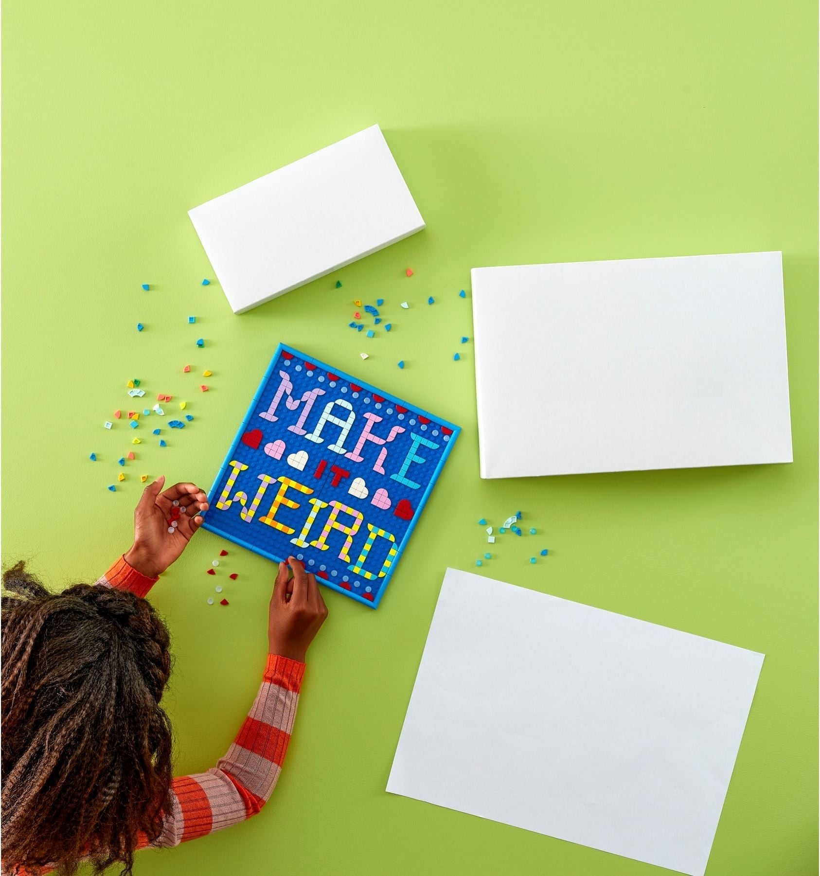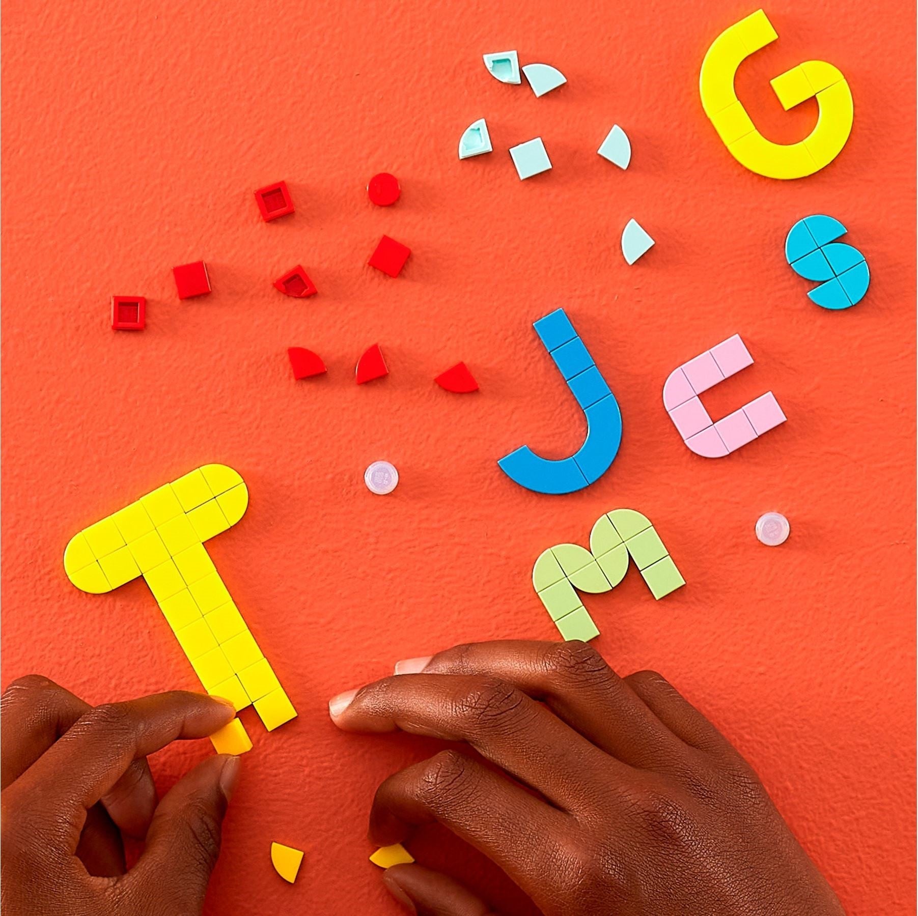Say it in colorThis box features tiles in different fun colors and shapes, including curved 2x2 elements to help kids make customizable fonts and letters. This lets them decorate their message boards or room decor craft items however they like to build their creative skills.