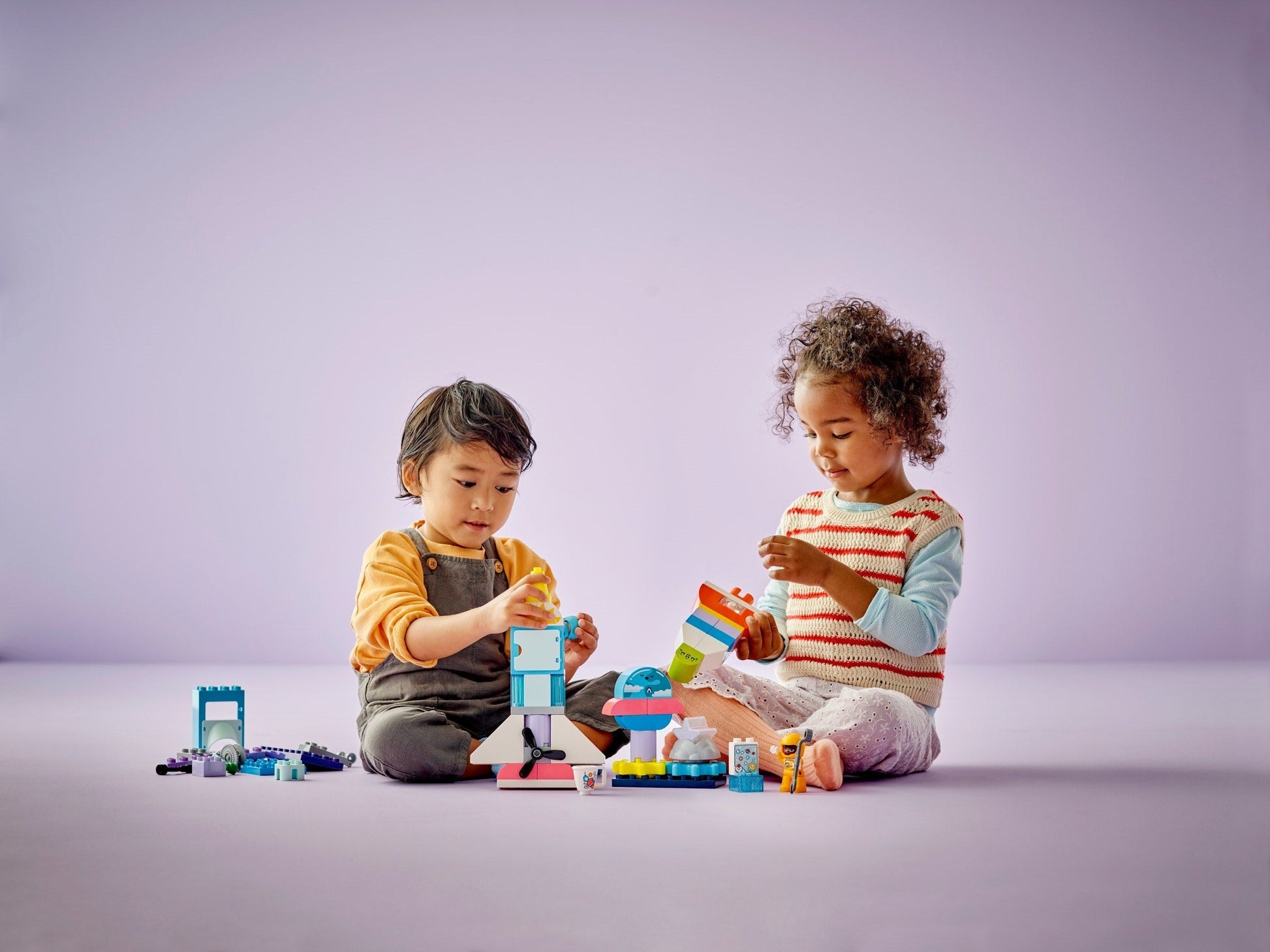 This space toy is packed with fun accessories to spark creative play. Preschool kids explore new horizons as they invent fun outer-space adventures for the 2 LEGO DUPLO astronaut figures, such as making friends with an alien or going on a space walk to mend the rocket with their toy wrench.