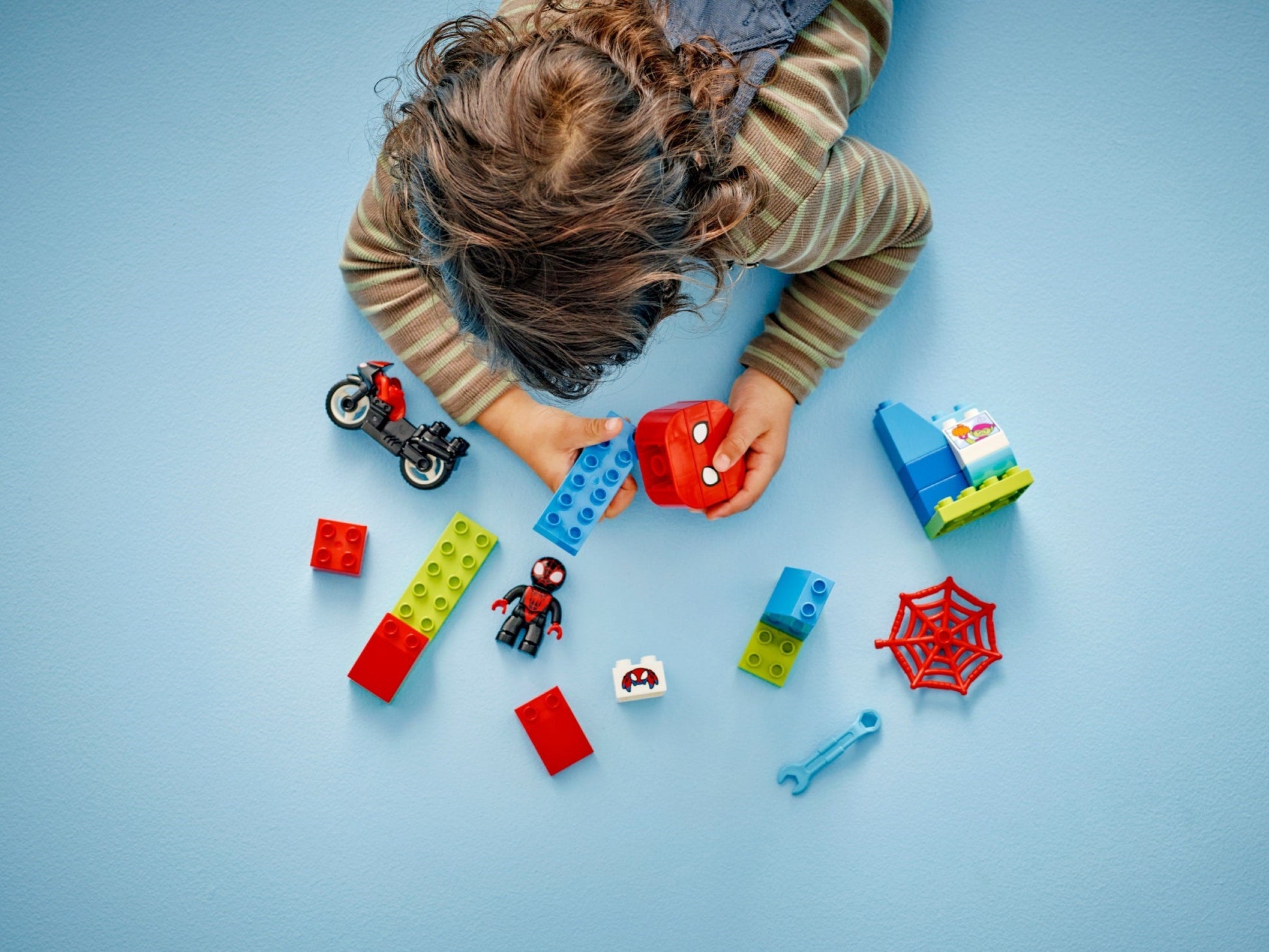 Perfect for short and fun everyday play sessions, this Spidey fantasy playset comes with a LEGO DUPLO Spin figure, a motorcycle toy, and a buildable headquarters. Preschool kids drive Spin’s motorcycle over the buildable toy ramp to launch him into action. Amid the battle, little Super Heroes help the Spin toy figure avoid the flying bricks by catching them in his web.