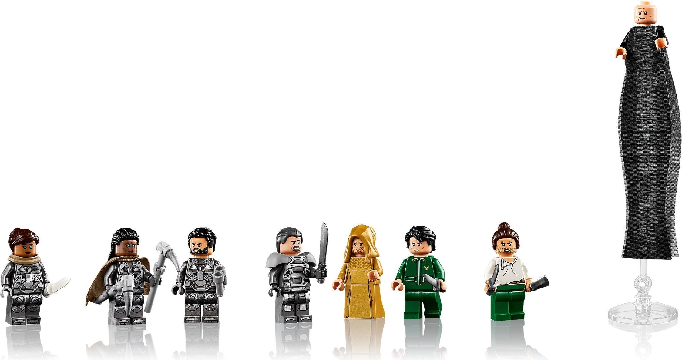 This premium-quality replica features fold-out, flappable wings, deployable landing gear, and an opening cockpit. The set also includes 8 iconic characters from the movie: Paul Atreides, Lady Jessica, Gurney Halleck, Chani, Leto Atreides, Liet Kynes, Duncan Idaho, and Baron Harkonnen in his long robe.
