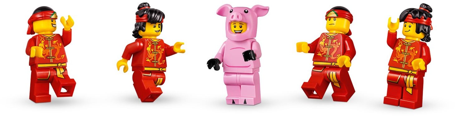 The set includes five minifigures, featuring a drummer and four dragon dancers, each holding poles to move the dragon segments. A cleverly designed mechanism allows the dragon’s body to sway and dance when operated, adding dynamic playability.
