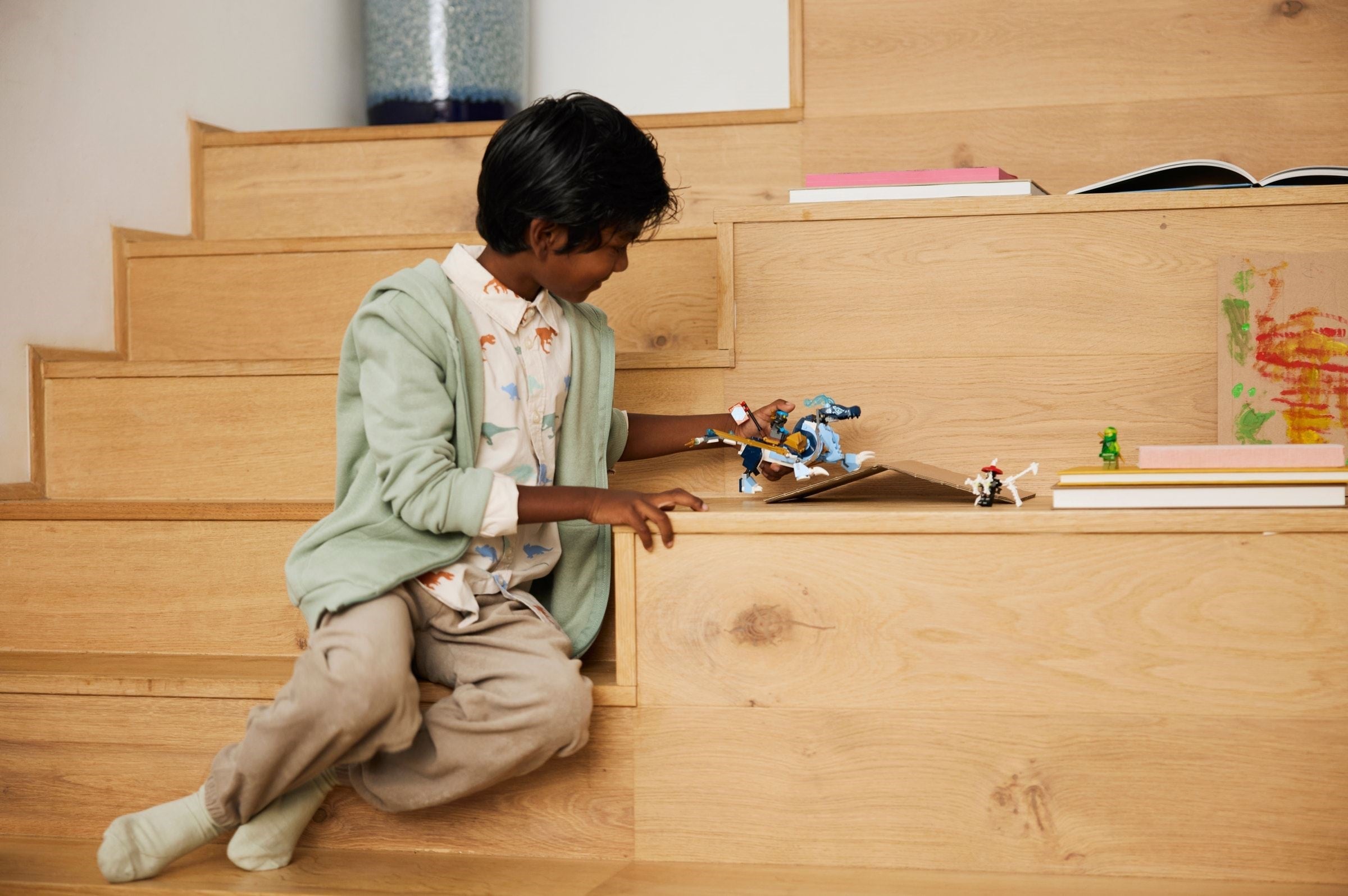 Ninja fans aged 6+ play out gripping adventures in the air, in the sea, or on the ground with Nya’s Water Dragon EVO (71800). The impressive LEGO® dragon features a posable head, jaw, legs, and wings, plus a tail that can be used as a weapon. It also has a saddle for Nya to sit in, and it can be upgraded with golden elements to make it even bigger and stronger.