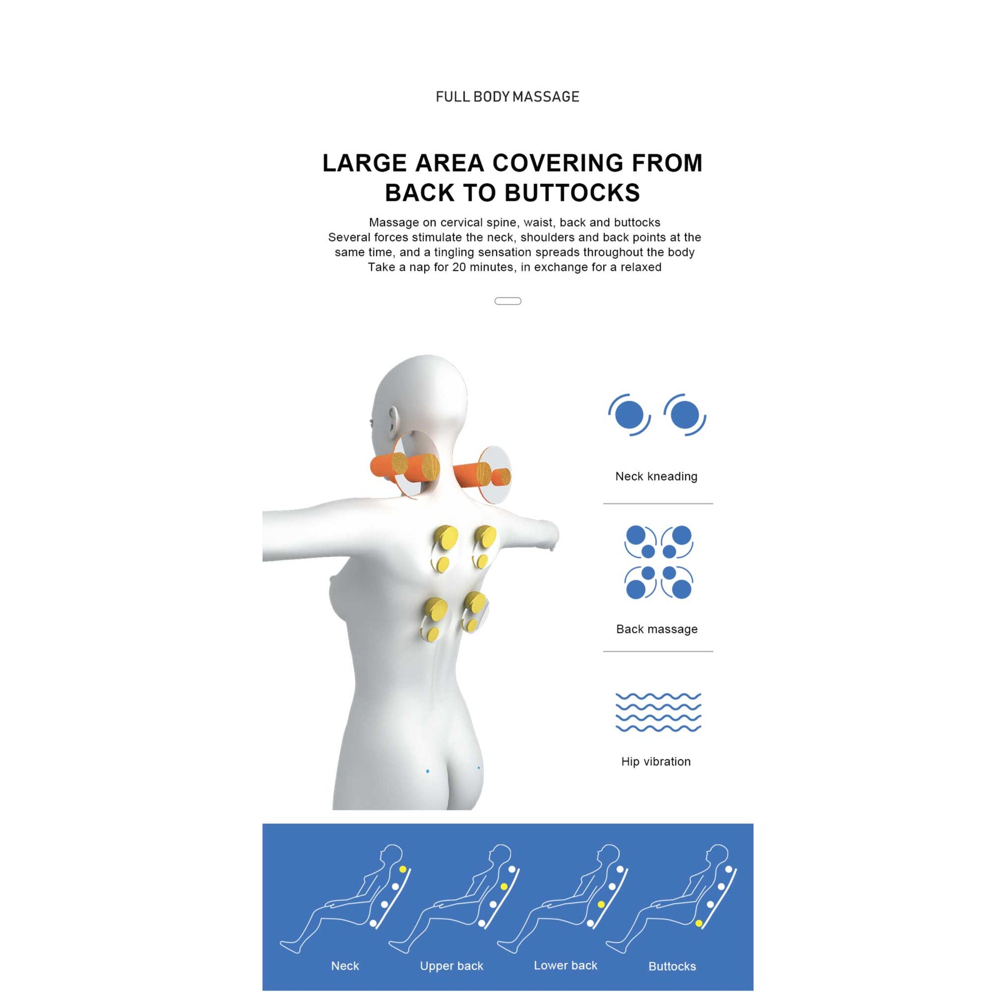 The cushion features 6 shiatsu kneading massage nodes for the back and 2 nodes for the neck.