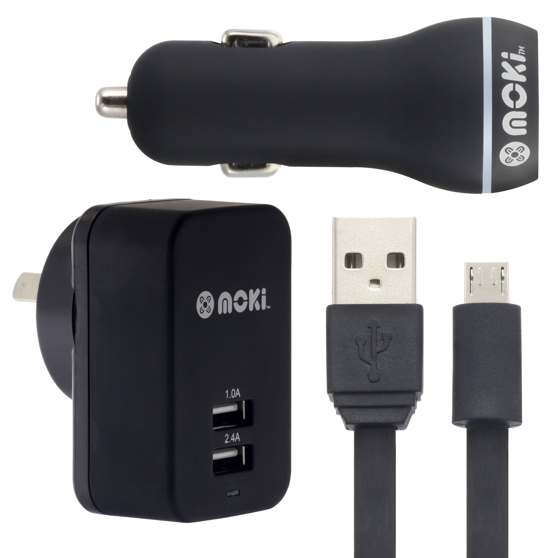 The Moki MicroUSB SynCharge Cable is perfect for car and home use. Standard USB can plug direct into your PC for charge and sync or to power adaptors for recharging only.• Micro to USB SynCharge 1.5m (4.9ft) cable• 3.4A dual USB (2.4A + 1A) wall charger• 3.4A dual USB (2.4A + 1A) car charger