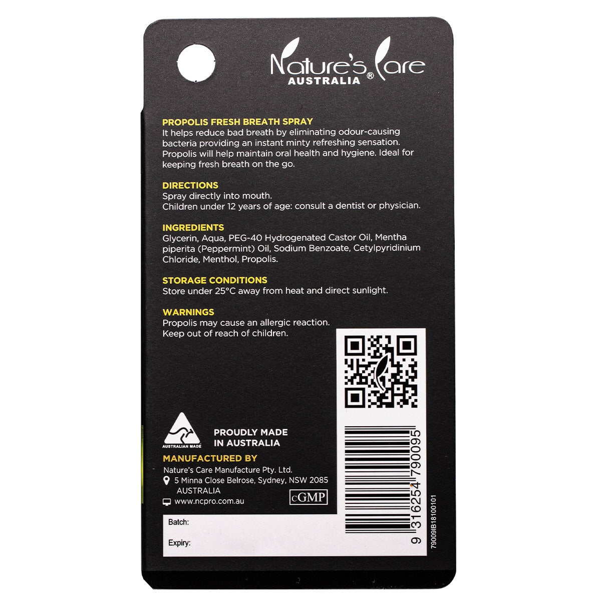 Experience the refreshing power of Nature's Care Pro Propolis Fresh Breath Spray. This convenient spray helps to eliminate odor-causing bacteria, reducing bad breath and providing an instant minty, fresh solution on the go. Enriched with propolis, it also supports oral health and hygiene.