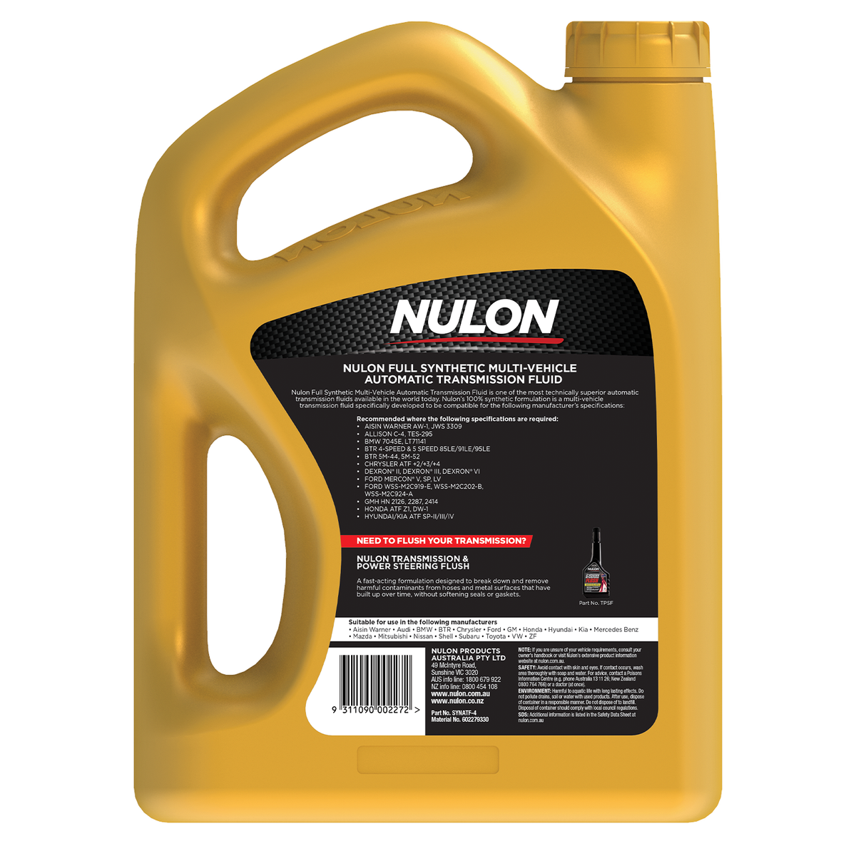 Nulon 4l Full Synthetic Automatic Transmission Fluid is a high-performance, multi-vehicle formula designed for various automatic transmission specifications.