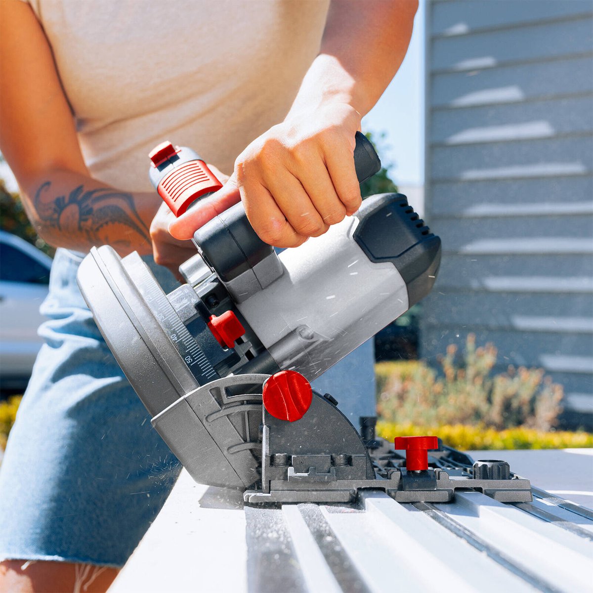 The Ozito 1200W Plunge Saw is engineered for accuracy and adaptability, making it an essential addition to any toolkit. It features a precision bevel cut adjustment that allows for clean cuts at angles up to 45°, ideal for creating angled edges and joints. The depth of cut is infinitely adjustable, reaching up to 56mm, accommodating various materials such as plywood, MDF, and laminate. An enclosed guard with a dust extraction port enhances safety and cleanliness by minimising airborne dust. This saw is suitable for tasks such as cutting doors to size, crafting custom shelves, trimming flooring, and making precise furniture cuts. Its ergonomic design ensures comfort during use, while the robust motor provides efficiency for all projects. *Compatible with Ozito Plunge Saw Guide Rail PPT-2000 (Sold Separately). THIS PRODUCT IS INTENDED FOR DIY USE ONLY.