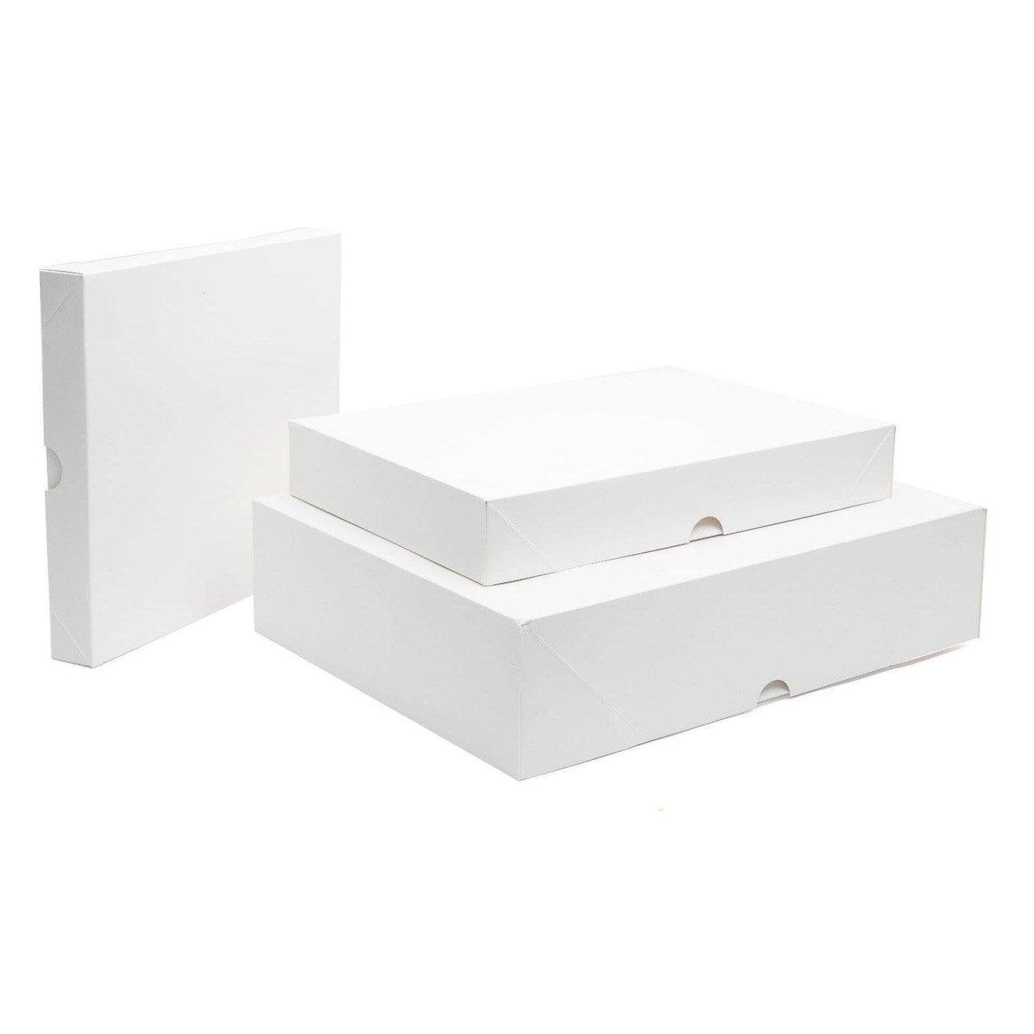 Material: White cardSizes: Small: 11 x 8.25 x 1.5 inches, Medium: 14.75 x 10 x 2.25 inches