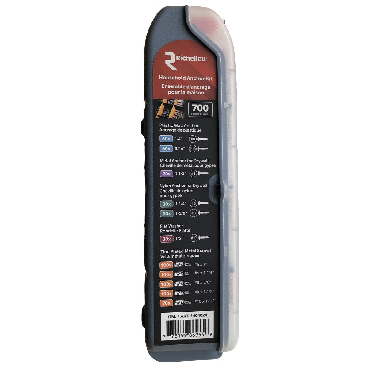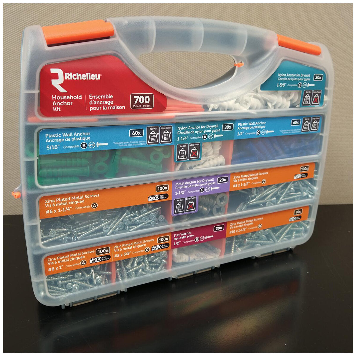 Keep your home repair essentials organized with the Richelieu 700-Piece Household Anchor and Hardware Kit. This comprehensive kit provides a convenient and compact storage solution for all your DIY needs. Perfect for home repairs, crafting projects, or even as a portable first aid or sewing kit.
