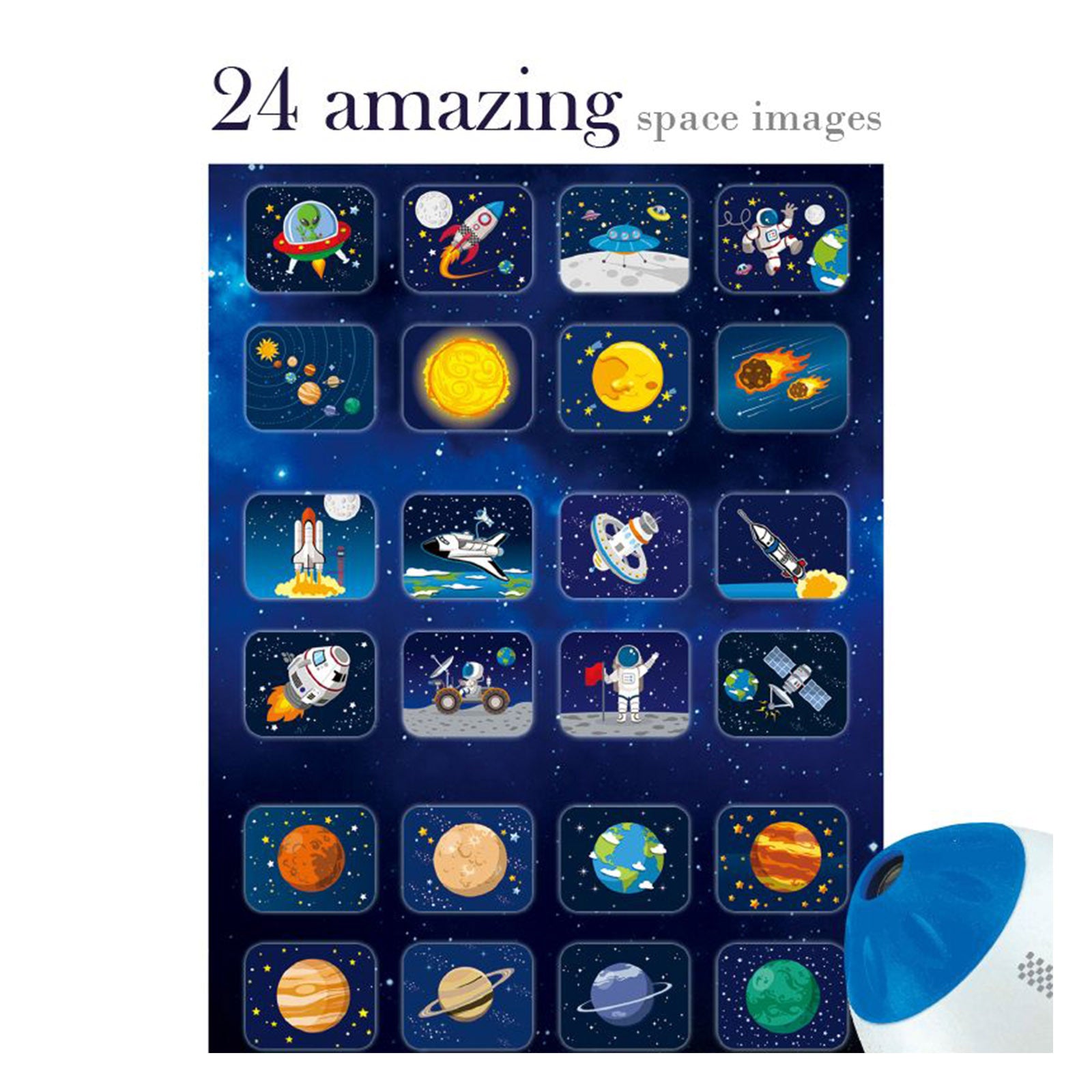 Turn your room into a vibrant outer space light show with 24 stunning space images! Just slot one of the three discs into the top of the rocket to project vivid images of spacecraft, astronauts, planets, and nebulae onto walls or ceilings, up to one meter wide. Twist the lens for sharp focus, and turn the disc to switch images.