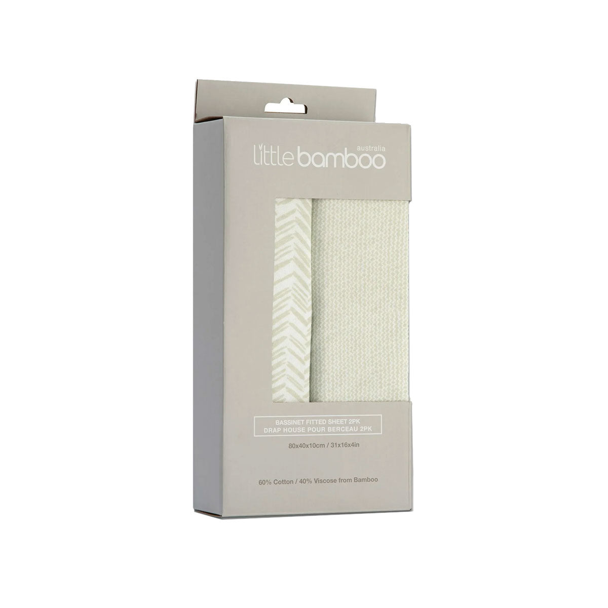 This Set of 2 Little Bamboo Jersey Fitted Sheet Bassinet Size Herringbone Whisper is deliciously soft and smooth, perfect for your baby's sensitive skin. Adorned in a charming herringbone pattern with a serene white and pale green hues, this sheet combines elegance with functionality. Made from a blend of bamboo and cotton, this sheet offers softness and breathability that will drift your little one into peaceful sleep.