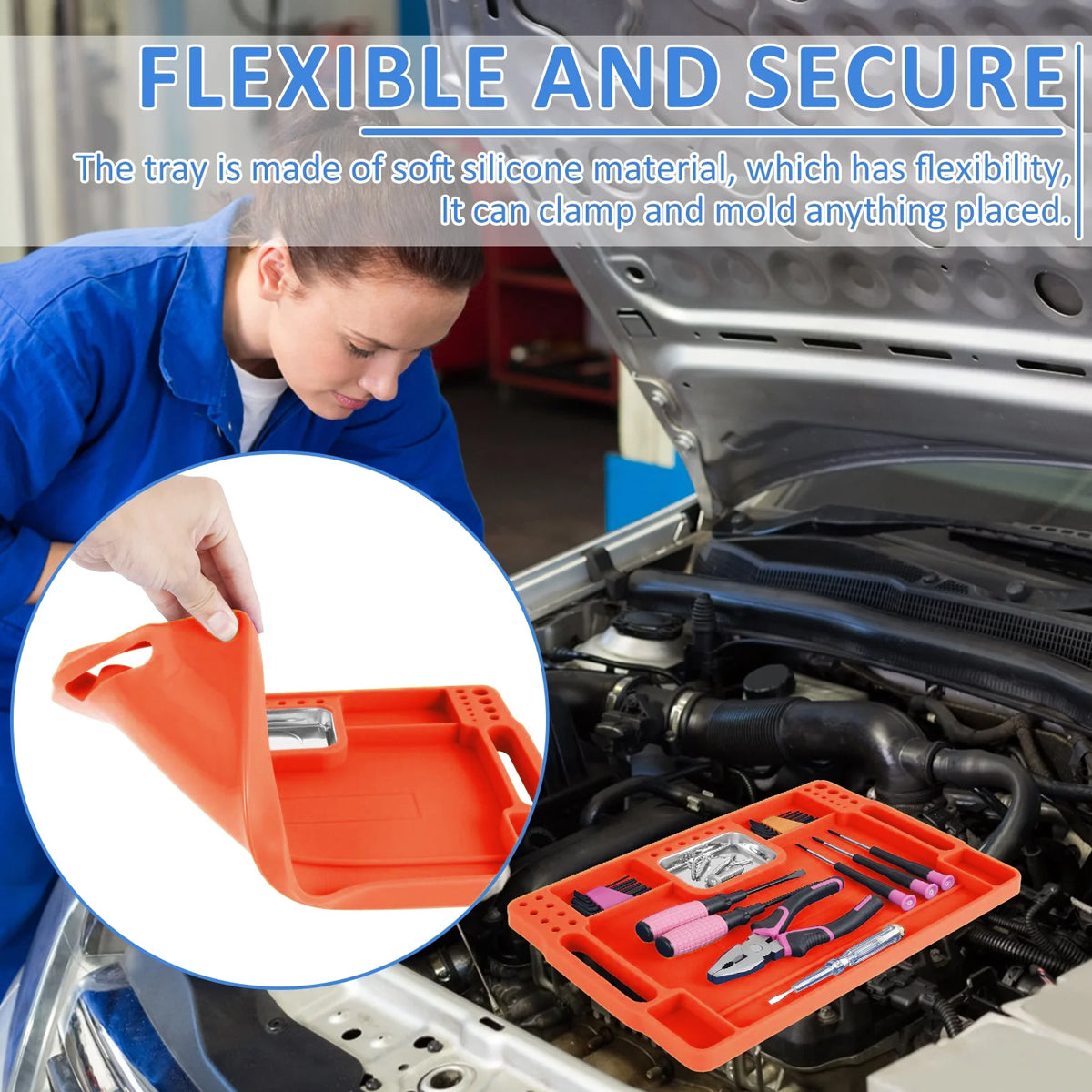 This silicone tool tray is a practical organizer designed for professionals and DIY enthusiasts, ensuring small parts and tools are always within reach during various projects. Its durable silicone body and removable stainless steel magnetic tray provide secure storage.