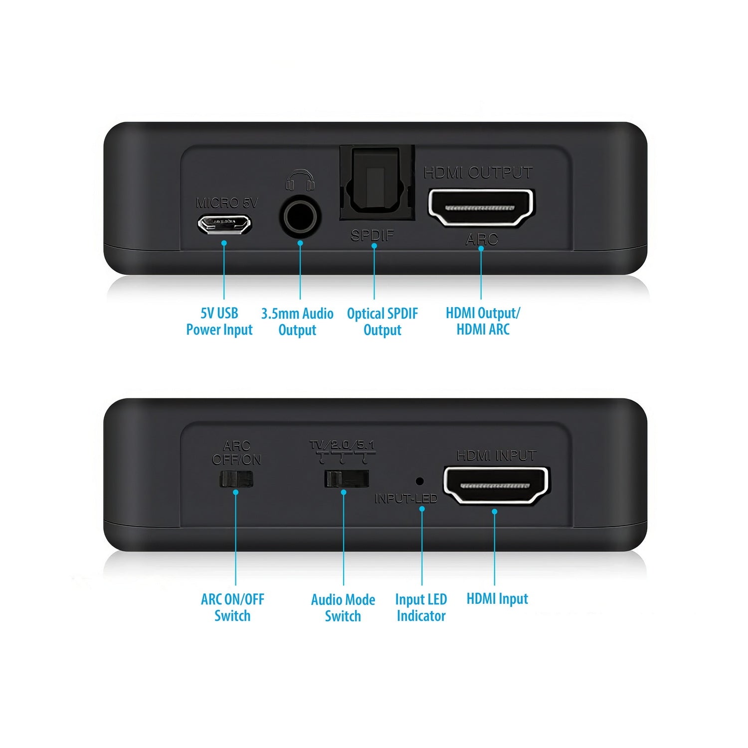 It allows you to extract embedded audio from an HDMI source or directly from an ARC-compatible TV, and output the audio separately through either a stereo connector or a digital optical SPDIF connector. It complies with HDMI 2.0b standards, and supports up to 18Gbps of bandwidth, perfect for home theatre setups, 4K gaming, or video streaming on a 4K display. This compact adapter can be placed behind your AV equipment and powered via USB, either from a wall charger or an available USB port on your TV.