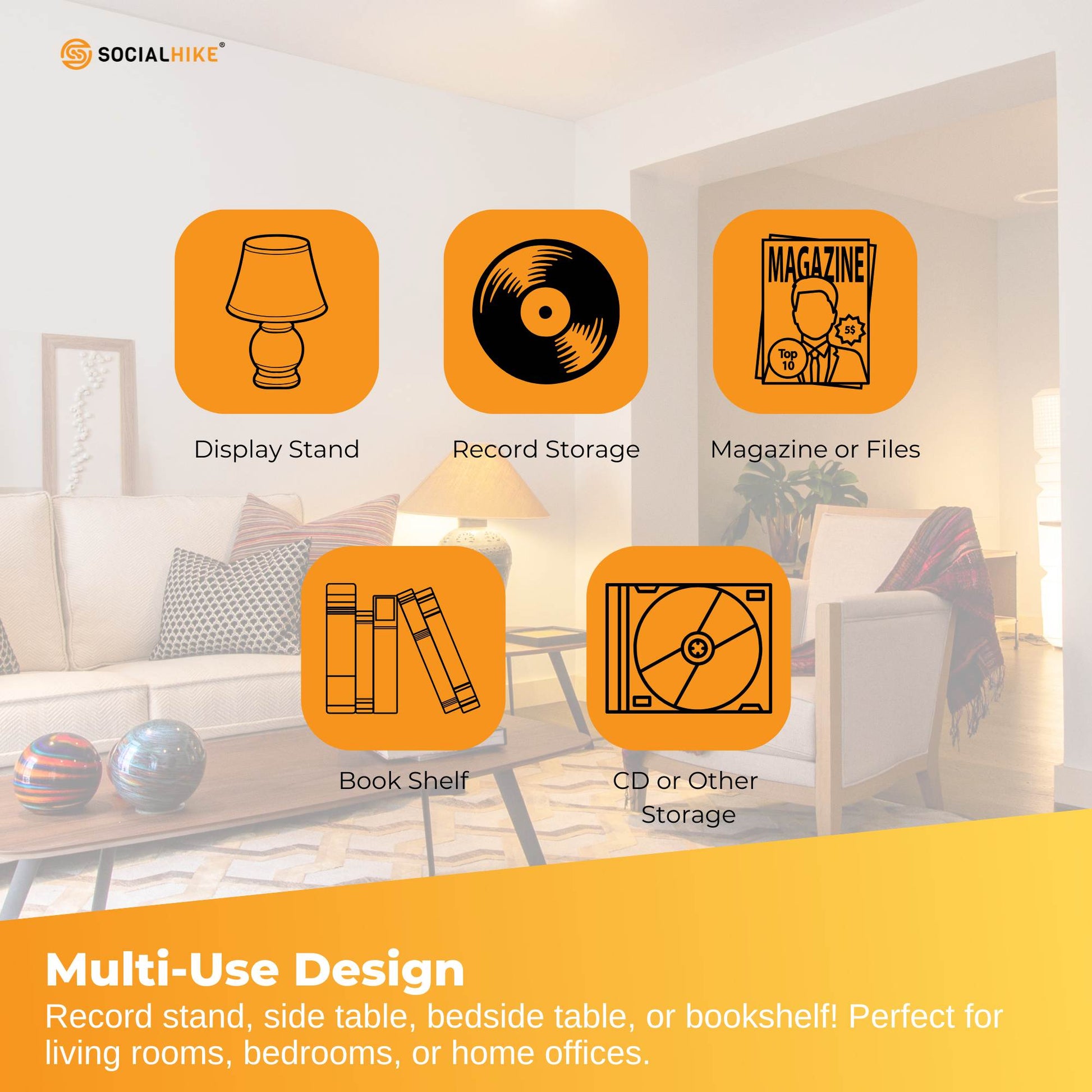 Built for durability, the stand’s sturdy metal legs and reinforced MDF wood construction support up to 45 kg, making it perfect for turntables, speakers, books, and decorative items. Whether in your living room, bedroom, office, or music studio, this multi-functional piece serves as a stylish record storage unit, side table, or bedside table.
