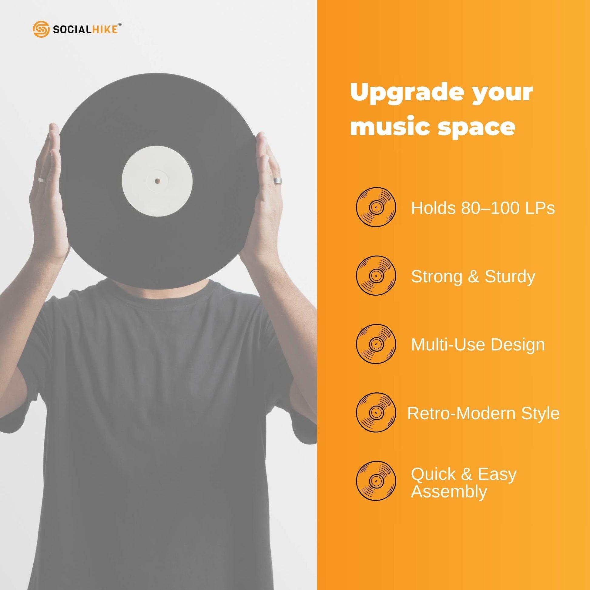 Upgrade your music space with this Social Hike Turntable Player Stand Vinyl LP Record Album Storage - Black Metal. A stylish and functional record player stand, designed to keep your vinyl collection organised. Featuring a spacious two-tier design, this stand holds up to 80–100 records, with a V-shaped metal storage rack for easy access to your favourite albums. The rustic brown wooden tabletop blends seamlessly with a modern matte black metal frame, adding a touch of vintage charm to any room.