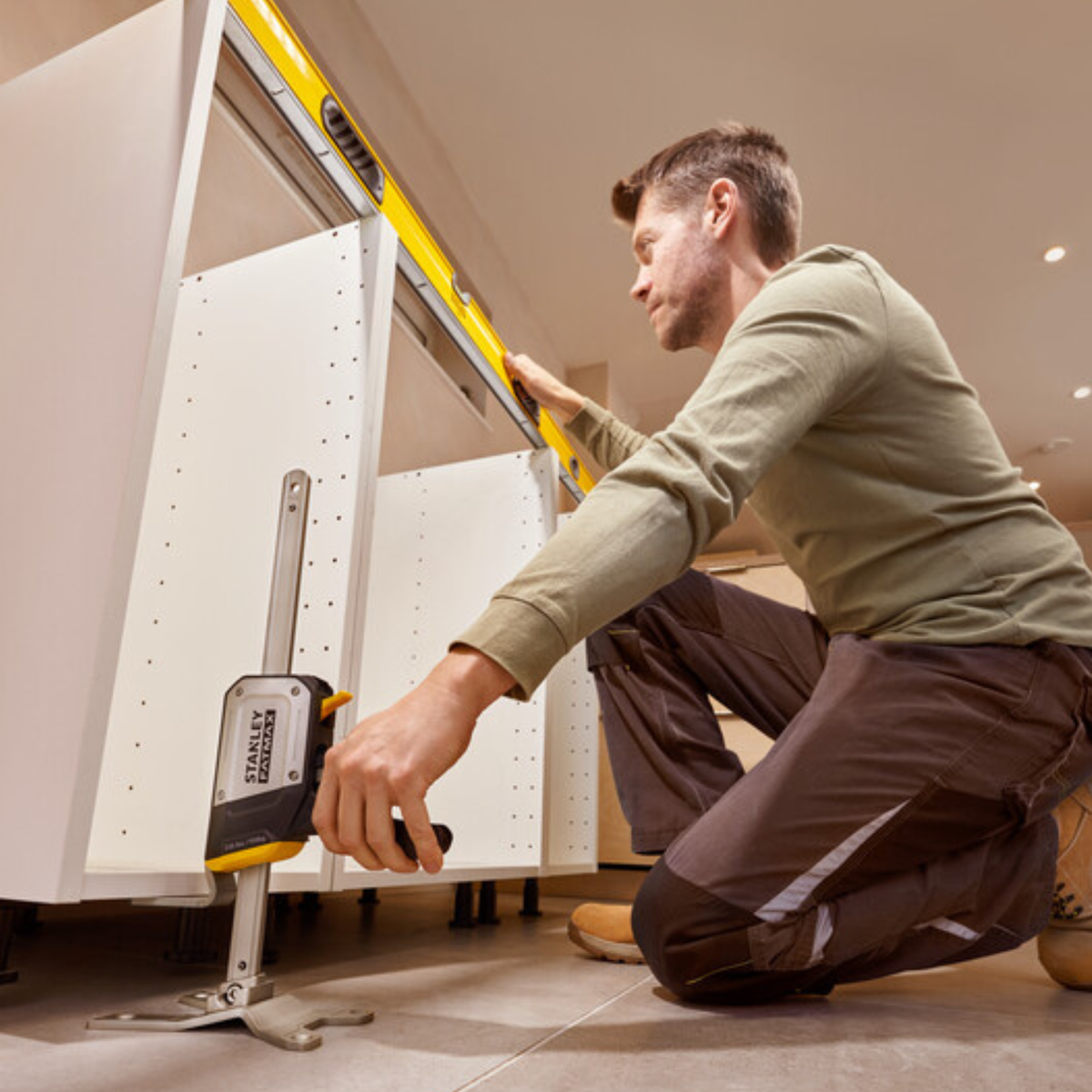 The Stanley Fatmax Tradelift is a versatile handheld tool engineered for lifting, holding, spacing, and levelling heavy or awkward objects such as appliances, sheet materials, or furniture. It allows for hands-free operation with a reinforced push down lever that can be activated by foot. Capable of lifting up to 150kg to a maximum height of 220mm, it is suitable for various trades, including kitchen, floor, door, and window fitting, as well as carpentry and general building tasks. The ergonomic design features a moulded handle for enhanced grip and control, while a fine adjuster allows for precise lowering of loads. The robust construction includes an enclosed metal plate housing for durability and dust prevention, making it ideal for use in diverse environments.