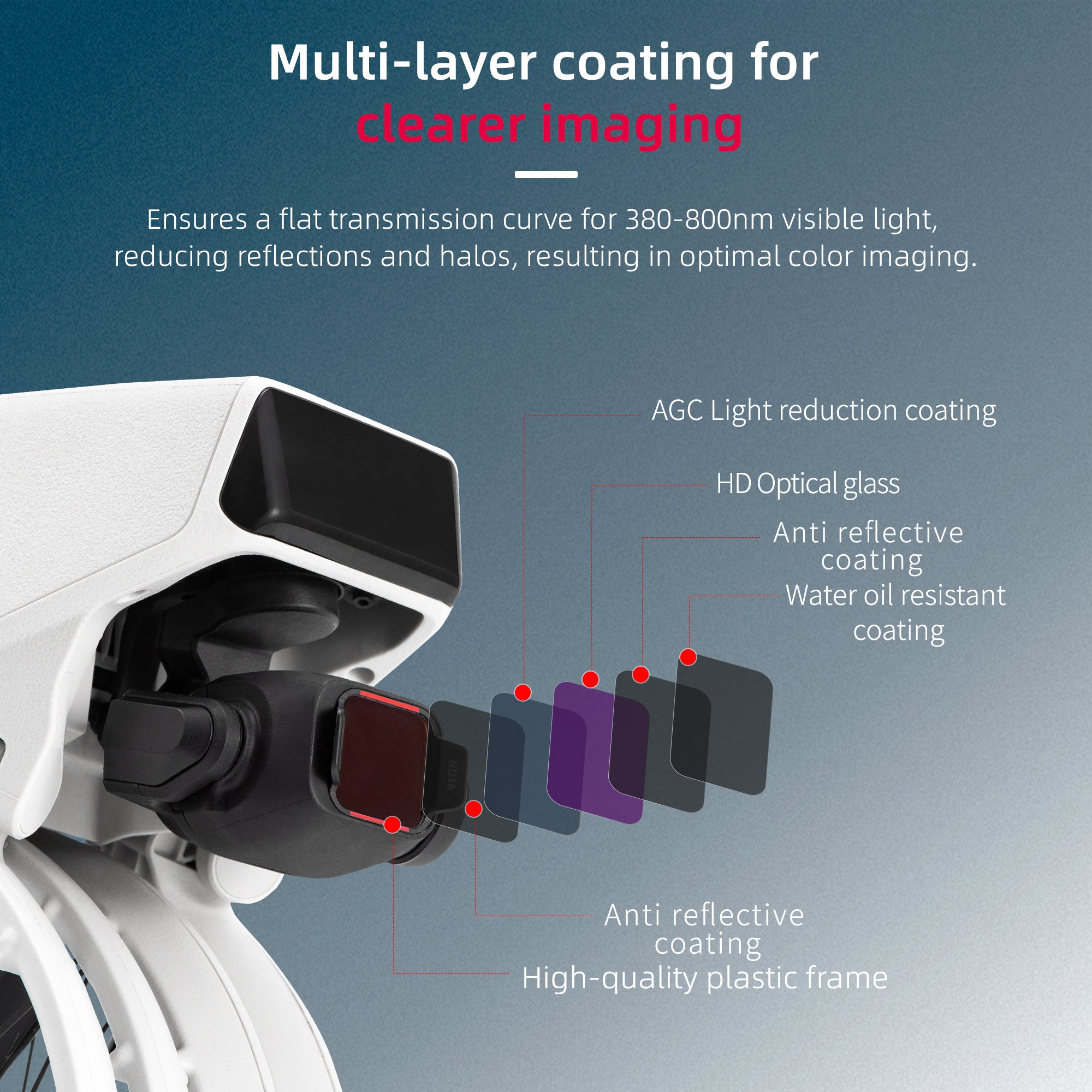 • Multi-Layer Coating:Each filter is made of high-definition optical glass, which has been ground and polished many times, with more than 30 layers of coatings, which is waterproof, anti-scratch, dustproof, and oil-proof, and protects your drone lens from all-around injuries