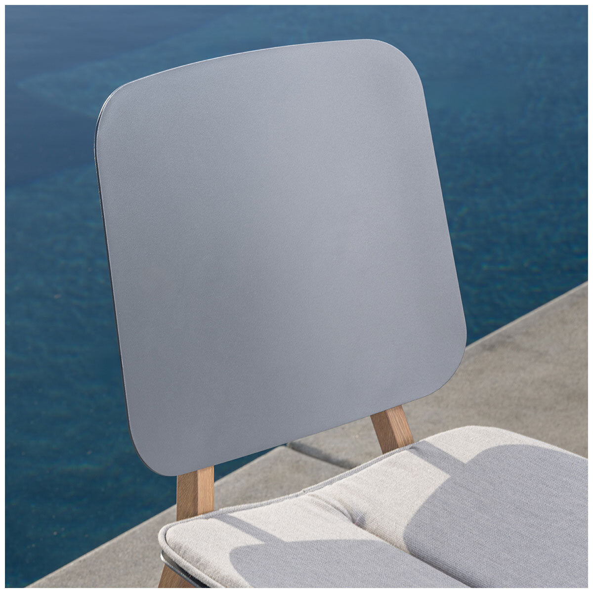 The Biblos set features six comfortable dining chairs with a beautiful wood-grain finish on the aluminium legs, complementing the sleek Permastone sintered stone tabletop. Permastone is renowned for its resistance to scratches, stains, and the elements, ensuring your dining set remains beautiful for years to come.