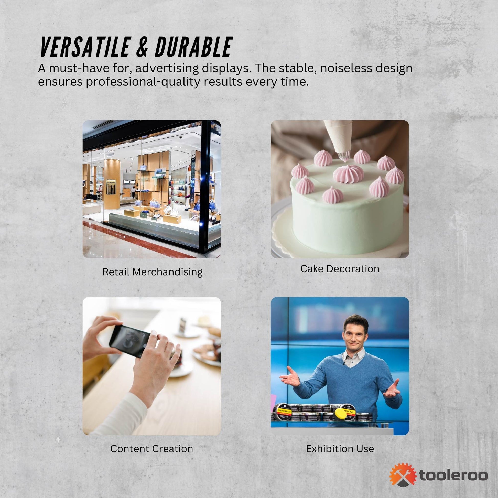 Tooleroo 3-in-1 Electric Rotating Display Stand – Elevate your product presentations with this 360° motorised turntable, designed for photography, videography, and retail displays. Featuring adjustable speeds, three interchangeable platform sizes, and multiple rotation angles, this quiet, USB-powered display stand comes with the option of using a rechargeable battery, and is perfect for showcasing jewellery, electronics, cakes, and more. Remote-controlled for effortless operation, it supports up to 10kg and ensures smooth, stable rotation—ideal for professional merchandising and content creation.