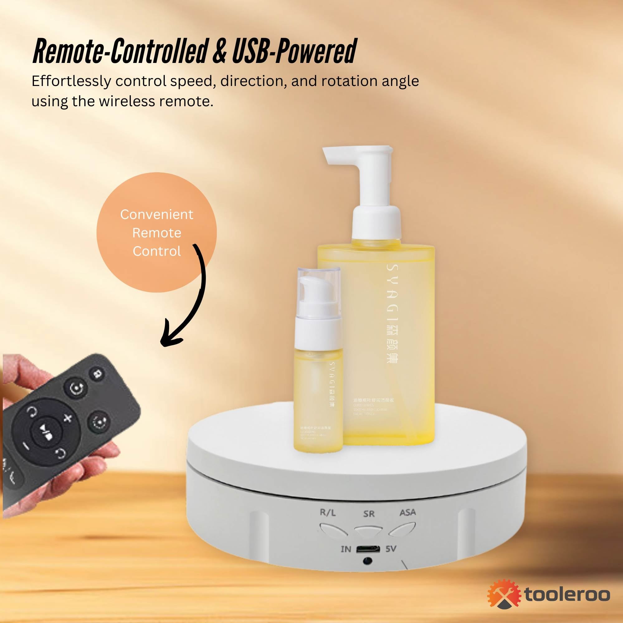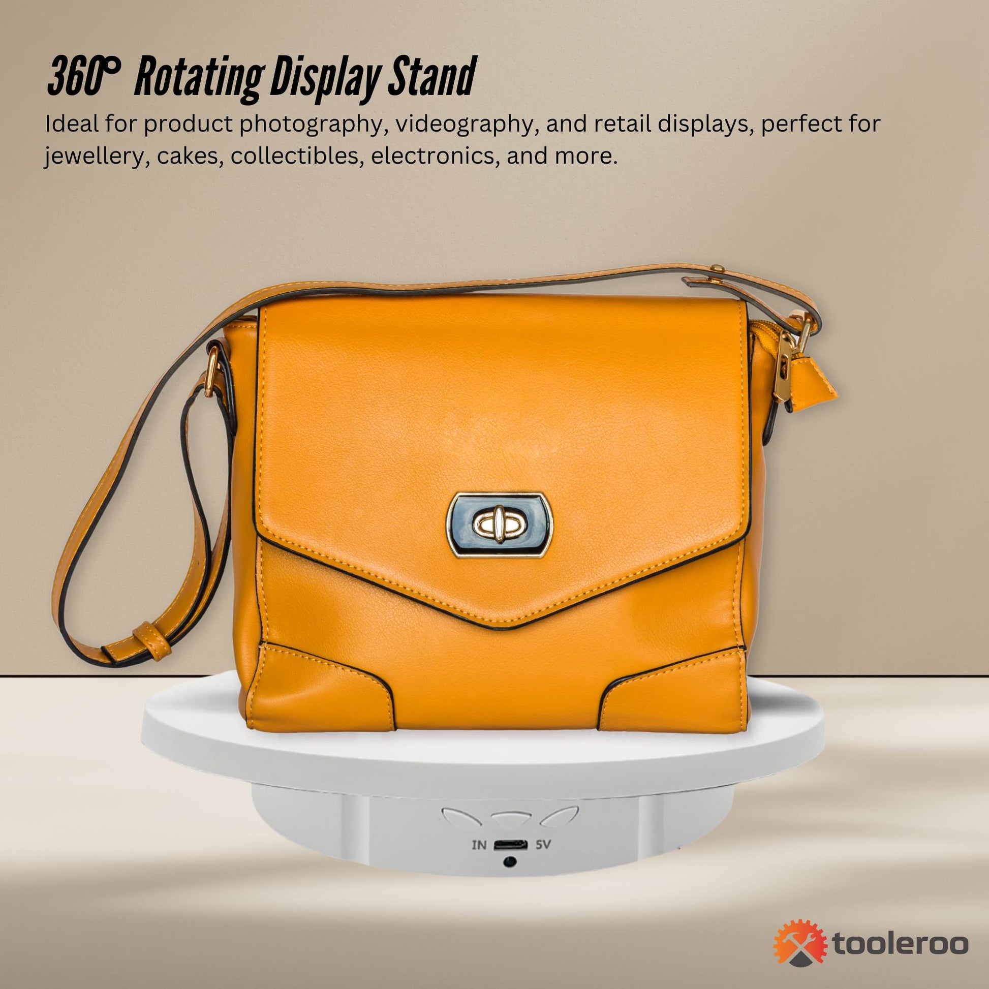 Tooleroo 3-in-1 Electric Rotating Display Stand – Elevate your product presentations with this 360° motorised turntable, designed for photography, videography, and retail displays. Featuring adjustable speeds, three interchangeable platform sizes, and multiple rotation angles, this quiet, USB-powered display stand comes with the option of using a rechargeable battery, and is perfect for showcasing jewellery, electronics, cakes, and more. Remote-controlled for effortless operation, it supports up to 10kg and ensures smooth, stable rotation—ideal for professional merchandising and content creation.