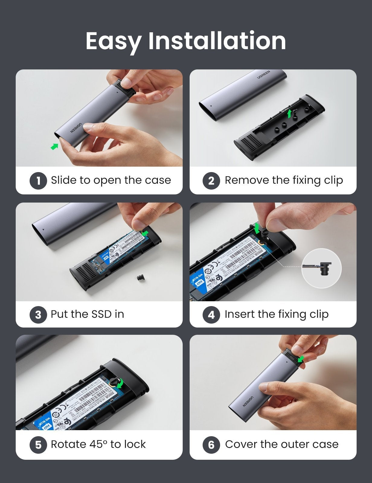 Portable NVMe M.2 SSD External EnclosureUGREEN M.2 USB-C Enclosure is designed to house an M-Key or M+B Key NVMe PCIe SSD and turn it into a portable USB 3.1 external drive for maximum utilization. Tool-free and no driver needed, just plug and play. Ideal for cloning files, backing up data, reusing old M.2 SSD, expanding storage space.10Gbp SuperSpeed & UASP SupportedThe USB 3.1 interface incorporates with UASP (USB Attached SCSI Protocol) that enables it to perform a 70% faster read speed and 40% faster write speed than conventional USB 3.1 when used with a UASP-enabled host computer.Main FeaturesPlug & Play and Hot-Swapping. Easy installation & no driver required. No additional power required.Support all 2230 2242 2260 2280 PCIe NVMe M.2 SSD of M-Key or M+B Key form factor.Support UASP, S.M.A.R.T and TRIM.Constructed with aluminum alloy which is better for heat dissipation, no worry about over-heat.Built with short-circuit, over-current and multi-protection to ensure safety for your SSD and valuable data.Designed for NVMe PCIe M.2 SSDThe NVMe M.2 Caddy features a sleek and compact size(L122 × W40 × H12mm), it is specially designed for M-Key and M+B Key PCIe NVMe M.2 SSD of 2230/2242/2260/2280 from factors up to 2TB, Does not support NGFF SATA based B-Key and M&B-Key M.2 SSD, M.2 PCIe AHCI SSD, mSATA SSD.Wide CompatibilityM-Key M.2 SSD: Compatible with Samsung 970 EVO Plus 250GB/500GB/1TB, Samsung 970 EVO 250GB/500GB/1TB/2TB, Samsung 970 Pro, Samsung 960 EVO, Samsung 950 PRO, Crucial P1 500GB/1TB, WD Black SN750 250GB/500GB/1TB/2TB, WD Blue SN500 2280, Intel 760P Series, ADATA XPG SX8000/XPG SX8200, CORSAIR Force Series, Plextor M8Pe, Plextor M9Pe, HP EX900, Kingston A1000, PNY CS2030,Seagate BarraCuda 510/ FireCuda 510, EXTREME PRO 3D SSD 500GB/1GB;M+B Key M.2 NVMe PCIe SSD: Compatible with Kingston A1000, Intel Optane 800P, Toshiba RC100, Pioneer APS-SE10G-512;USB USB-C & USB-A Devices SupportedFor USB-A devices, compatible with Sony PlayStation 4,PS4 Slim,PS4 Pro,PS3, Xbox One S, USB-A to USB-C Cable is requested (not included)