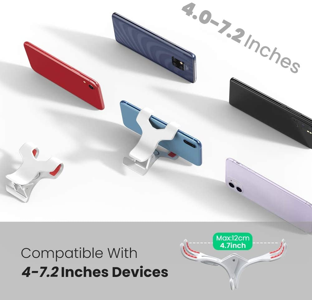 Flexible and Sturdy GooseneckUGREEN gooseneck phone holder with clamp allows you easily to twist its long arm to the proper position as you need, a lifesaver for protecting you from neck pain. It is a quite flexible overhead lazy phone mount for watching videos, facetime calls, reading, playing games or taking a virtual class when you are in a bedroom, living room, kitchen, office, gym and even laying in bed or sofa.Multi-Angle AdjustableWith 360 rotation ball-joint structure on the clip, this lazy bracket desk phone holder enables you to adjust it to a more comfortable viewing angle for horizontal, vertical, or any other angle viewing.Clip on the Desk SecurelyFeaturing an adjustable clamp base open maximum to 3.15-inch, this cellphone stand holder can be securely mounted on the bed frame, bedside, headboard, desk, nightstand, end table, kitchen counter and more. The non-slip silicone pads also protect your furniture from sliding and scratching.